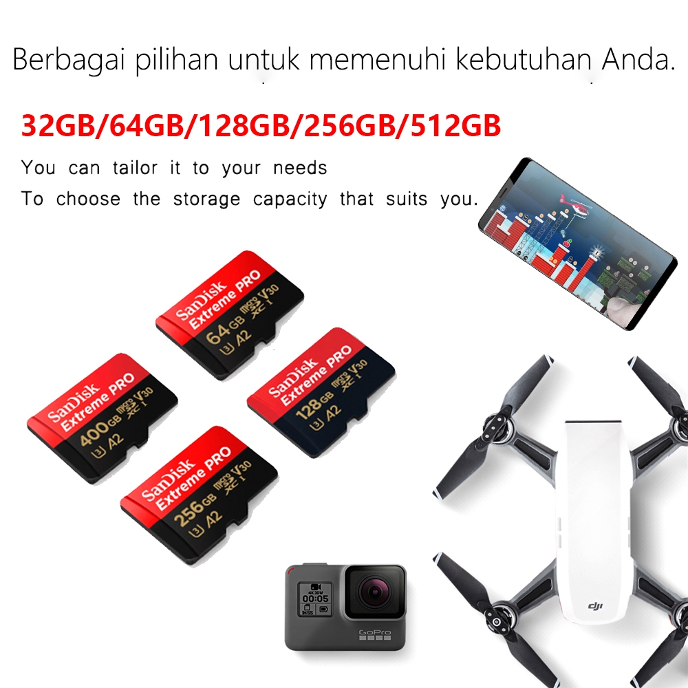Kartu Micro SD Sandisk Extreme Kecepatan Tinggi A2 128GB 256GB 512GB 1TB untuk Ponsel dan Kamera
