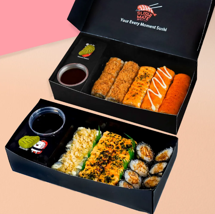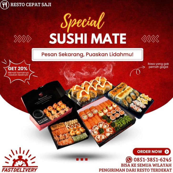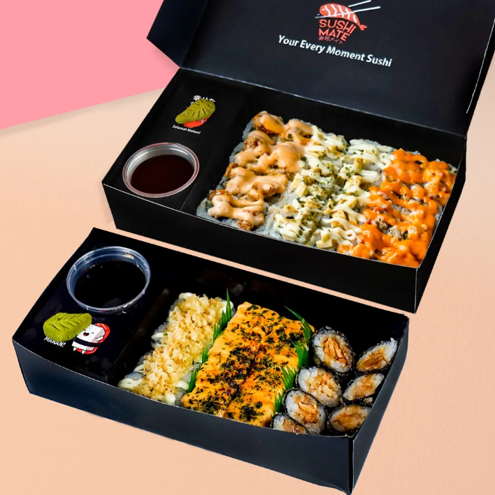 Sushi Mate Deals 1, Sushi Mate Deals 2, Sushi Mate Deals 3, Buy 1 Get 1 Sushi Platter, Sushi Siminimura Platter C, Non Spicy (24 pcs), Sushi Siminimura Platter A (20 pcs), Sushi Siminimura Platter B (24 pcs), simini party platter A (44 pcs), Simini Party Platter B, No Spicy (48 Pcs), Sushi Salmon Platter Jr (24 pcs), Sushi Maumura Platter (16 pcs), Sushi Brother Mate platter, No spicy (8 pcs), Sushi Brave Mate Platter ( 8 Pcs), Sushi Yes Mate Platter, Non Spicy (16 pcs), Sushi Healing Mate Platter (8 pcs), Sushi Salmon favorite platter (16 pcs), Sushi Salmon Easy Platter (8 pcs), Sushi Salmon Mate Platter, No Spicy (12 pcs), Sushi Salmon Party Platter (32 Pcs), Sushi Gedemura Platter M (64 pcs), Sushi Gedemura Platter L (72 pcs), Sushi Gedemura Platter XL (88 pcs), Sushi Huramura Platter (32 pcs), Sushi Levelup Party Platter (32 Pcs), Sushi Happen Mate Platter, No Spicy ( 8 pcs), Sushi Go Mate Platter (8 pcs), Sushi Balance Mate Platter (8 pcs), Sushi Salmon Habit Platter (8 pcs), Sushi Salmon Go Platter, No Spicy (8 pcs), Sushi Simura Mate Platter (16 pcs), Sushi Dynamite Roll (8 pcs), Sushi Spicy Salmon Katsu (8 pcs), Aburi Salmon Mentai Roll Sushi, No Spicy (8 pcs), Salmon Cheese Roll Sushi, No Spicy (8pcs), Chicken Tamago Pizza Sushi, Crunchy Maki (3 pcs), Chicken Maki Sushi (3 pcs), Salmon Maki Sushi (3 pcs), Salmon Volcano Sushi, Inari Sushi, Tamago Nigiri Sushi, Salmon Aburi Nigiri Sushi Mentai, Salmon Aburi Nigiri Sushi, Beef Volcano Sushi, Kani Cheese Gunkan Sushi, Tamago Dynamite Gunkan Sushi, Tobiko Corn Gunkan Sushi, Corn Cheese Gunkan Sushi, Spicy Mentai Mayo, Dynamite Mayo, Cheese Mayo, Mentai Mayo, Sweet Sauce (Teriyaki), Wasabi, Cheese Sauce, Togarashi (Cabe Bubuk), Tanuki (Crunchy), Shoyu (Kecap Asin), Edamame, Fried Salmon Skin, Fanta, Sprite, Nestle Orange, Nestle Jasmine Tea, Ocha Tea, Coca Cola, Air Mineral