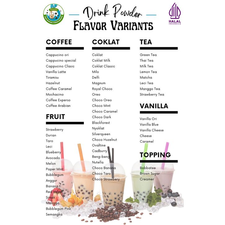 ANGGUR, AVOCADO, BANANA, BENG BENG, BISCUIT HITAM, BLACKFOREST, BLUEBERRY, BROWNSUGAR, BUBBLEGUM, BUBBLEGUM PINK, CAPP CLASICC, CAPP SPECIAL, CAPUCINO, CATBURYEEE, CHESSE, CHOCO BISQUIT HITAM, CHOCO CARAMEL, CHOCO DARK, CHOCO HAZELNUT, COFFE CARAMEL, COKLAT, COKLAT MILK, DELFI, DURIAN, GREEN TEA, HAZELNUT, LECY, LECY TEA, LEMON TEA, MAGNUM, MANGGA, MANGGO TEA, MELON, MILO, MOCACHINO, NUTELLA, NYOKLAT, OVALTINE, REDVELVET, ROYAL CHOCO, SILVERQUEEN, STAWBERRY TEA, STRAWBERRY, TARO, THAI TEA, TIRAMIZU, VANILLA, VANILLA BLUE, VANILLA CHESSE, VANILLA LATTE
