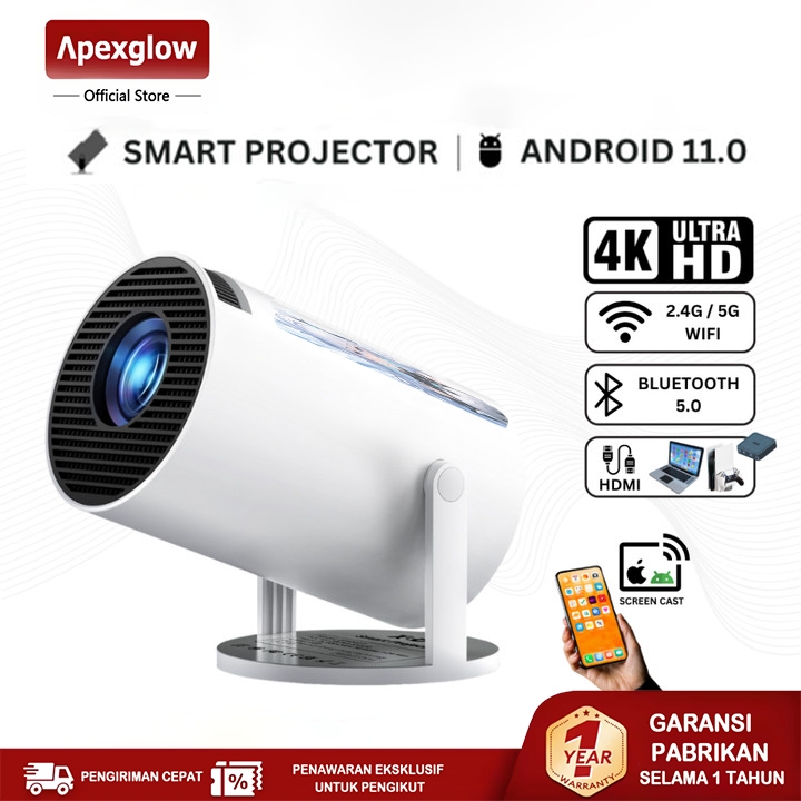 APEXGLOW Proyektor Android HY300 720P 4K LumenTinggi Portabel HomeTheater WiFiBT GaransiResmi