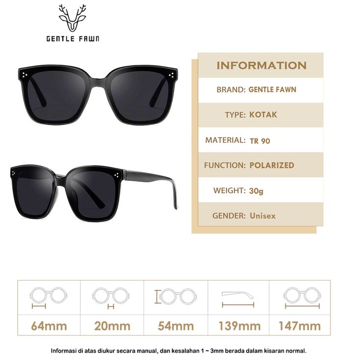 Gentle Fawn Kacamata Sunglasses Hitam Anti Silau 400 Polarized Bentuk Korean Style Pria Wanita Fashionable Kotak Bahan