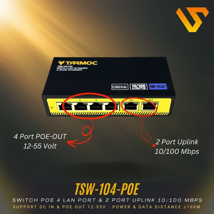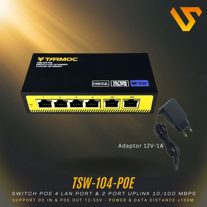 Tarmoc TSW-104-POE | Switch POE 4 Port + 2 Uplink 10/100Mbps, DC-in 12-55V - POE+ADP 12V-2A