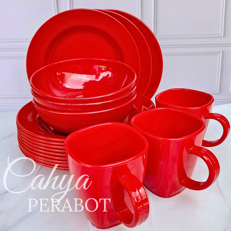 SET MELAMIN ISI 12 PCS CAMPUR 4 PIRING MAKAN 4 MANGKUK 4 GELAS MELAMIN TEBAL MERAH TERBARU