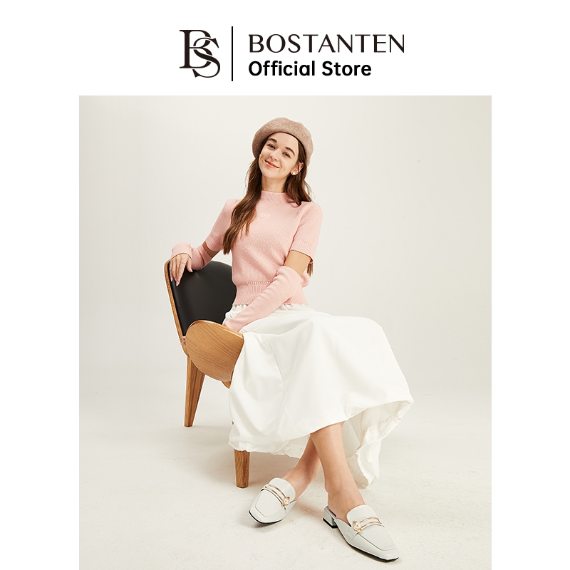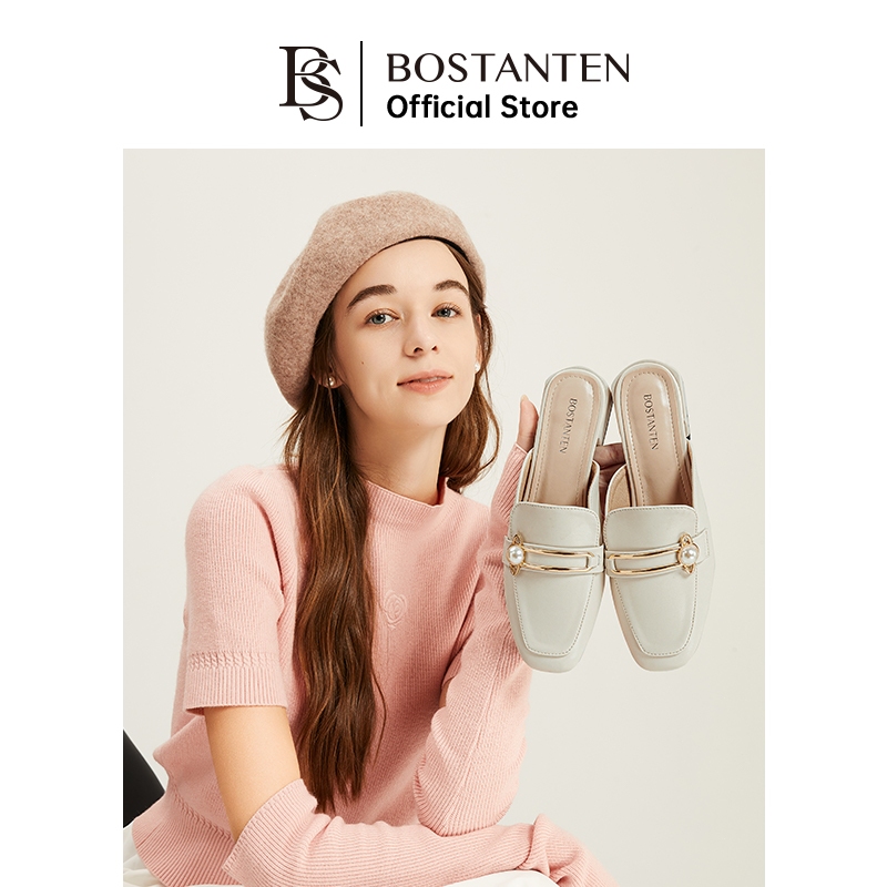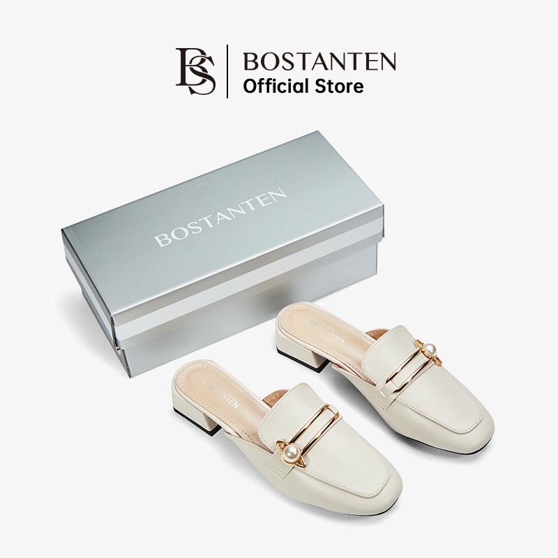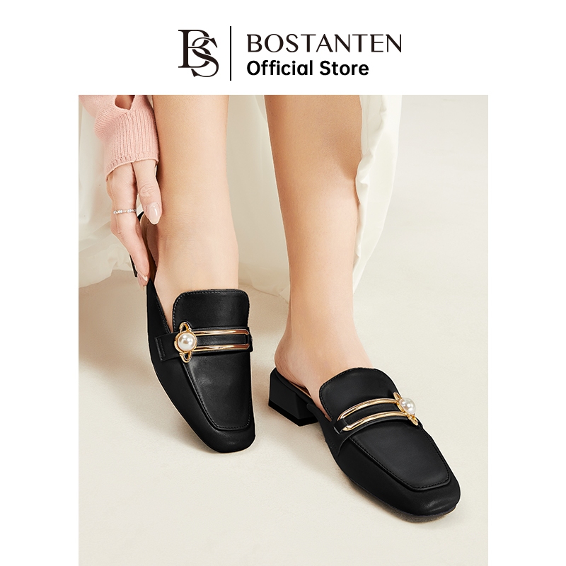 BOSTANTEN Sepatu Hak Tahu Sepatu Mules Flatshoes Heels Sepatu tunggal dengan tumit berat wanita, kepala persegi, sepatu mutiara kecil, sepatu rata