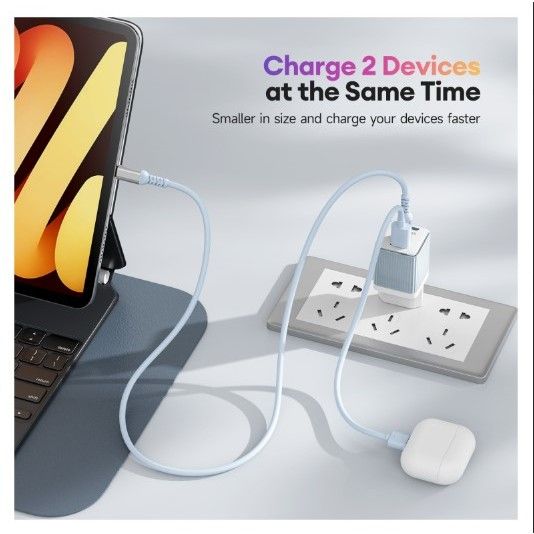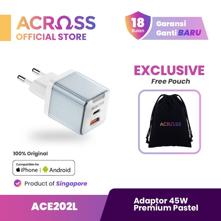 ACROSS Kepala Charger 45W Fast Charging Adaptor Charger IPhone & Android 2 Port Type C + USB PD QC 3.0 PPS - Pastel Blu