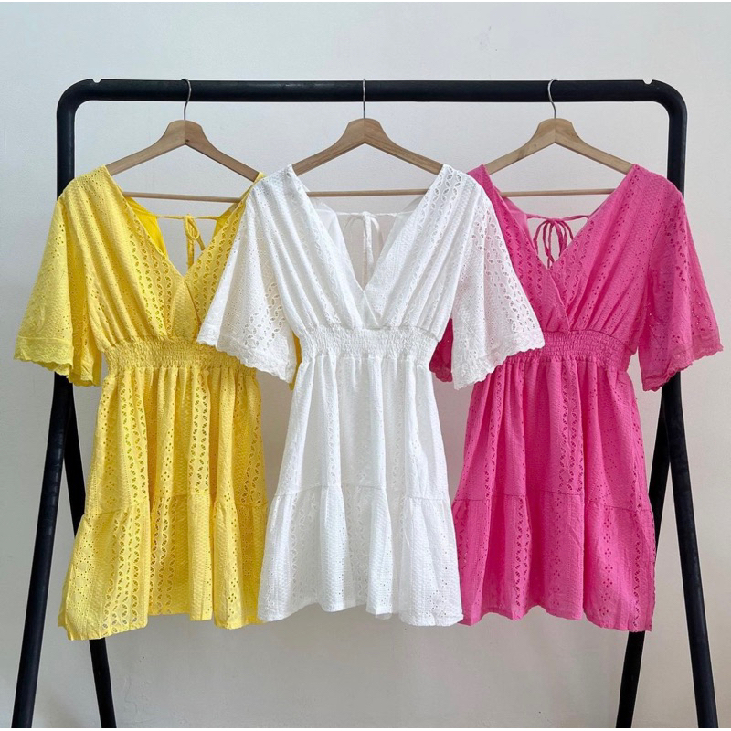 JOYIES Enju Dress Eyelet Korean Minimalis Chic Pantai Feminim Manis Liburan Gaun Wanita White Yellow Fuchsia V Neck y