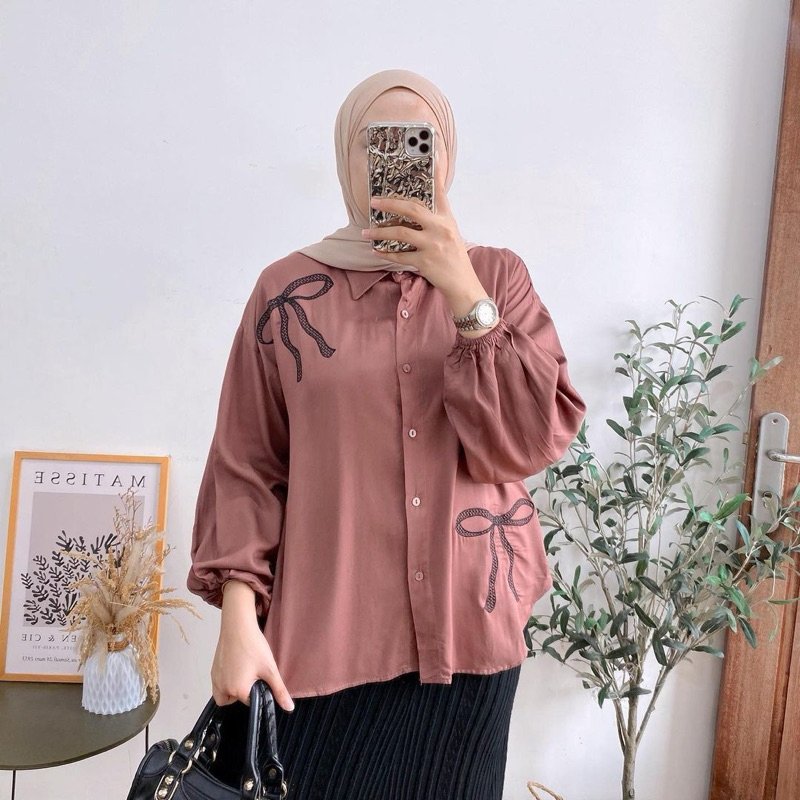 Lena Blouse | Kemeja Wanita Bordir Ribbon Shirt Rayon Twill Premium