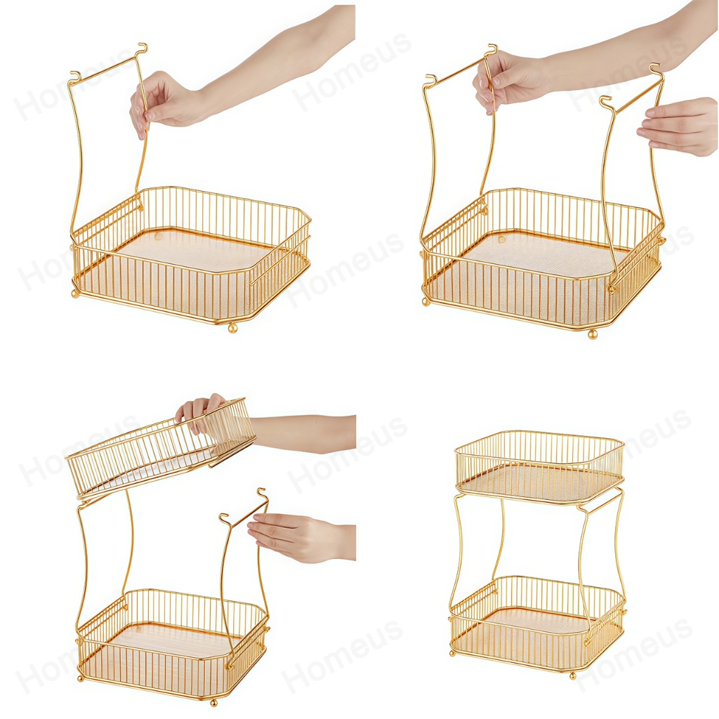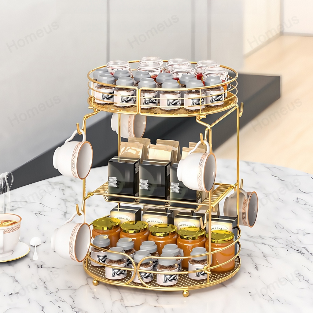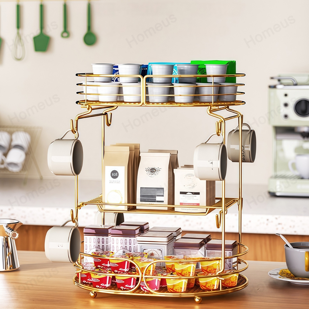 Homeus Rak Buah Sayur Emas Dua Lapis Holder Cangkir Kopi Multi Fungsi Mudah Pasang Dapur & Ruang Tamu