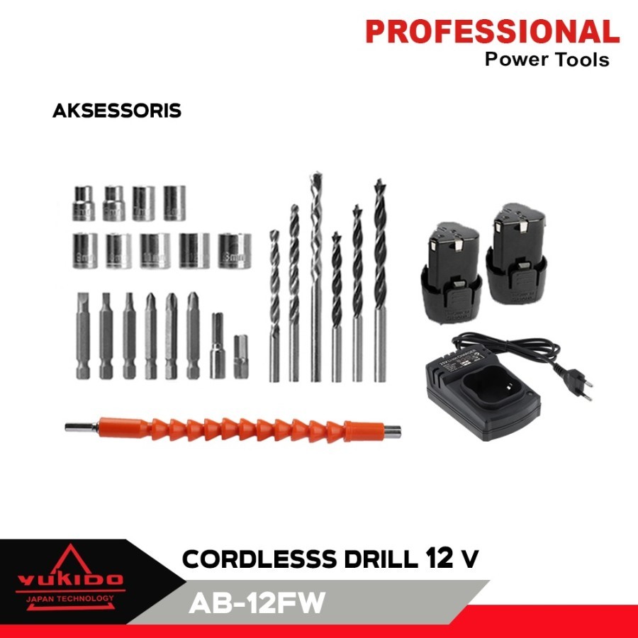 100%( ORI )YUKIDO Yelow 12V Mesin Bor Cordless bor listrik 2 baterai set - 12V 1 Baterai bor portable