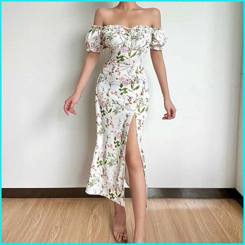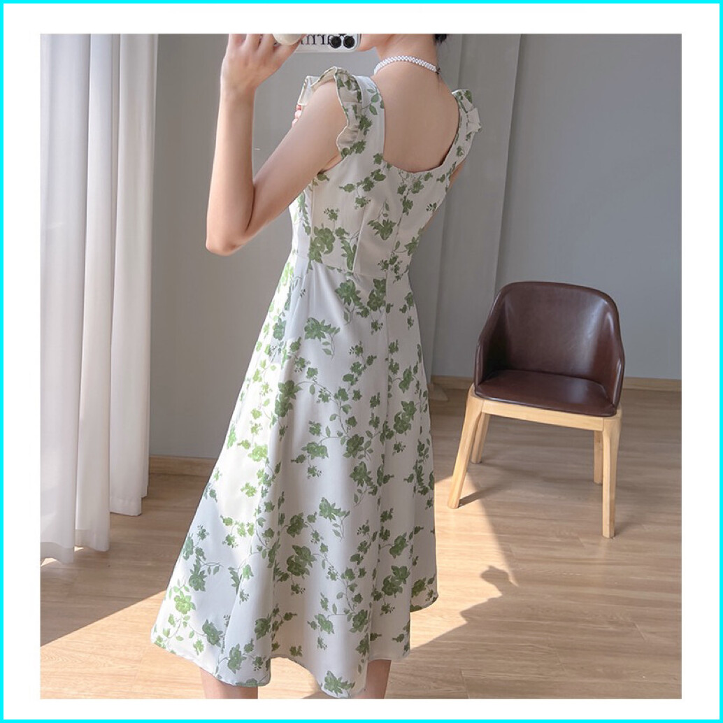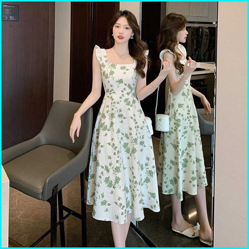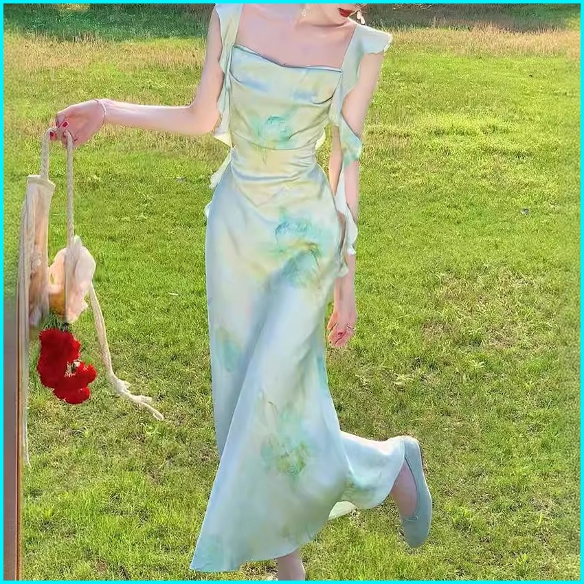 958 Sexy Sage Green Beach Dress Summer Korean Fairy Halter Sleeveless Floral 2xl Long Dress Hijau Wanita Bunga Bunga Pan