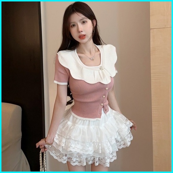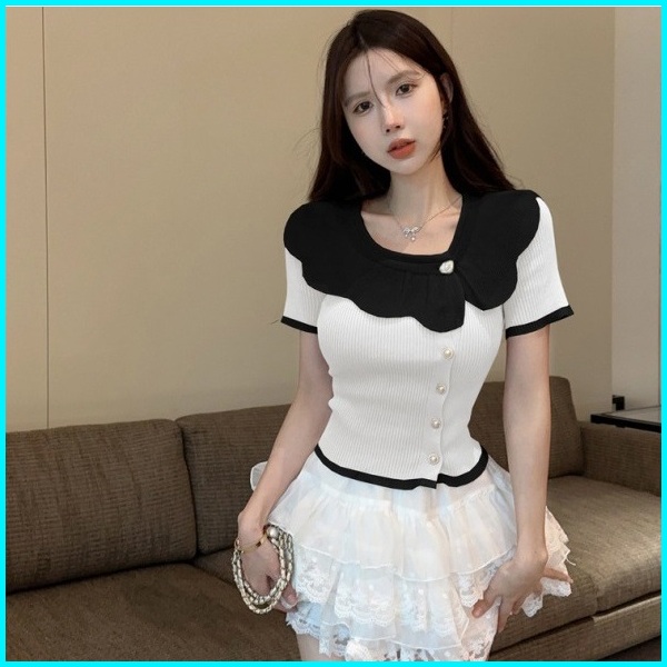 Ajw Atasan Kemeja Knit Kerah Renda Korean Style Hba Baju Wanita Lengan Pendek Crop Top Kerah Renda Kekinian Atasan Wanit