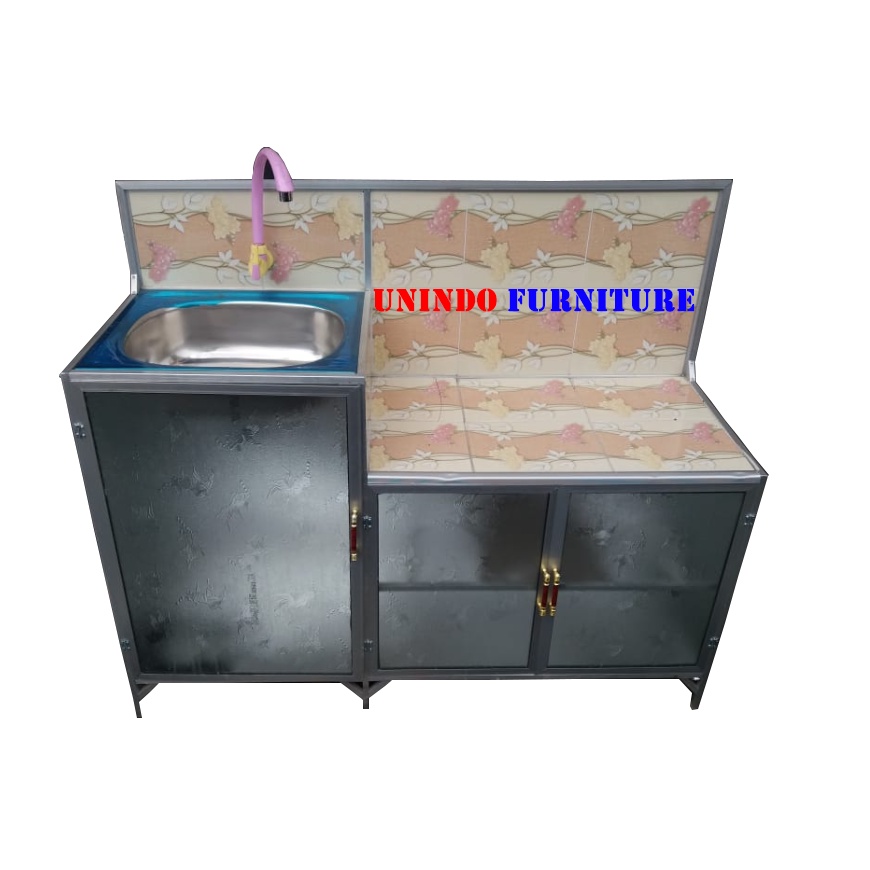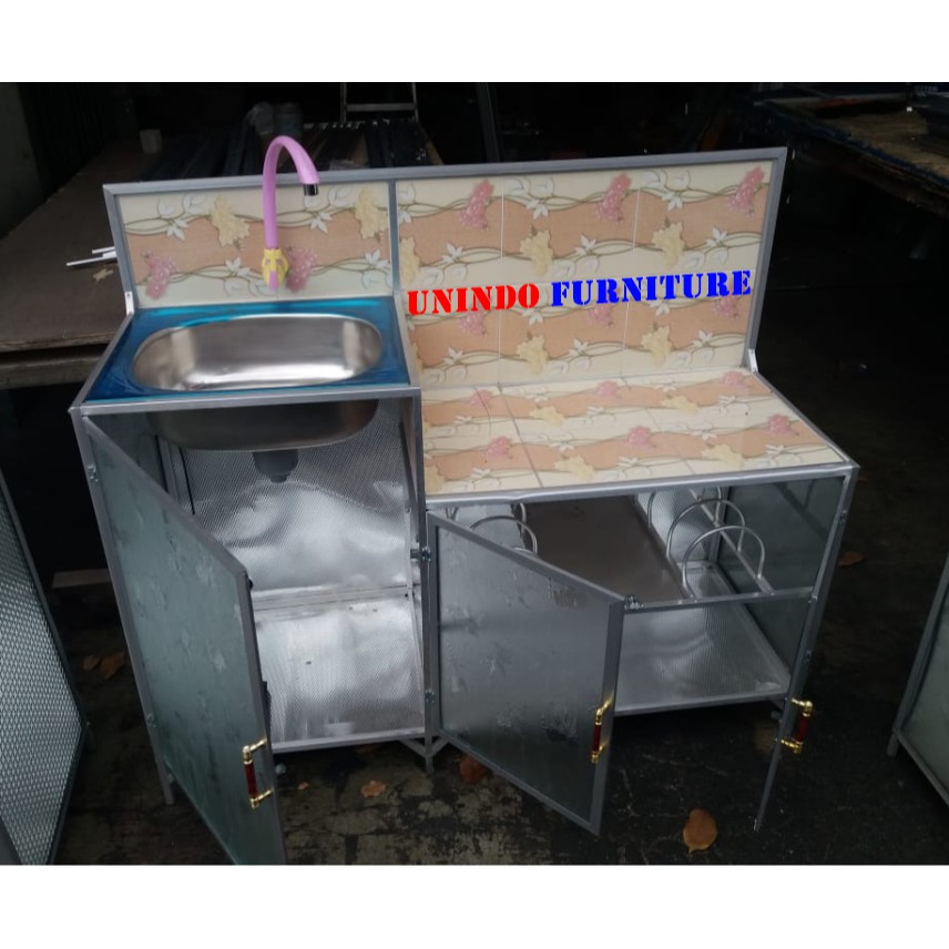 Meja Kompor Gas Alumunium Rak Cuci Piring Wastafel Dengan Meja Kompor 2 Tungku Lemari Rak Piring