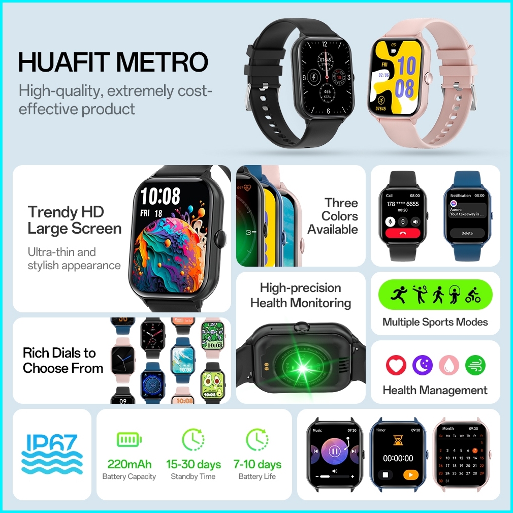 Huafit Metro Smartwatch 1.95inch Aod 24h Pemantauan Kesehatan 24 7 Wallpaper Kustom Running Pace Sports Jam Tangan Smart