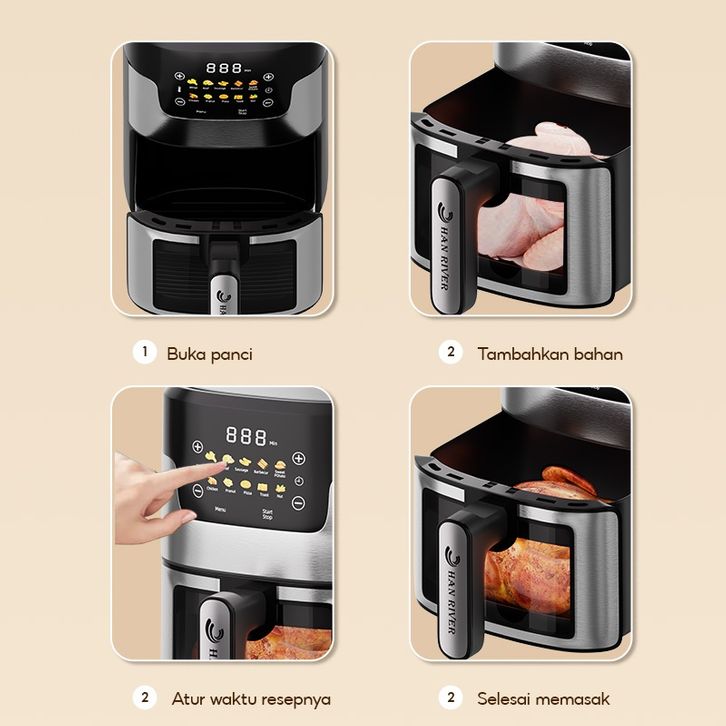 HAN RIVER Air Fryer Low Watt 650W Tubuh bajja tahan karat 8L multifungsi