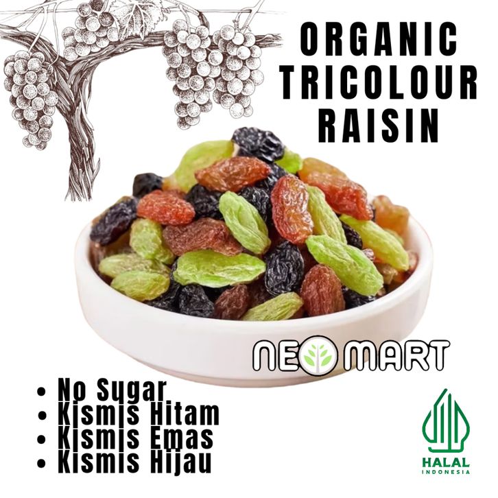 Tricolour Raisins Unsweetened 1kg(1.000gr)/ Kismis Emas, hijau dan Hitam / Kismis 3 warna/camilan food Snacks Toples