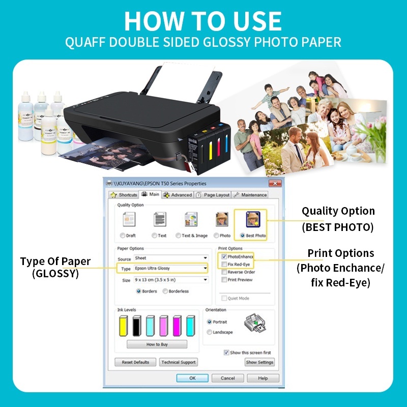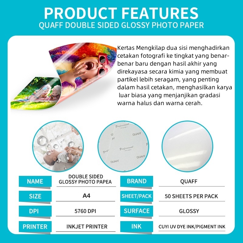 QUAFF Kertas Foto Dua Sisi /Double Sided Photo Paper ukuran A4 (50 lembar per bungkus) (120gsm-300gsm)