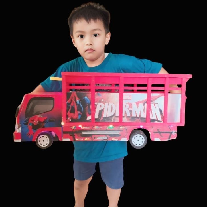miniatur truk oleng kayu motif sepiderman ukuran 60 free costum foto&nama truk oleng