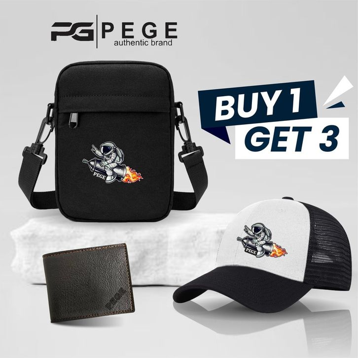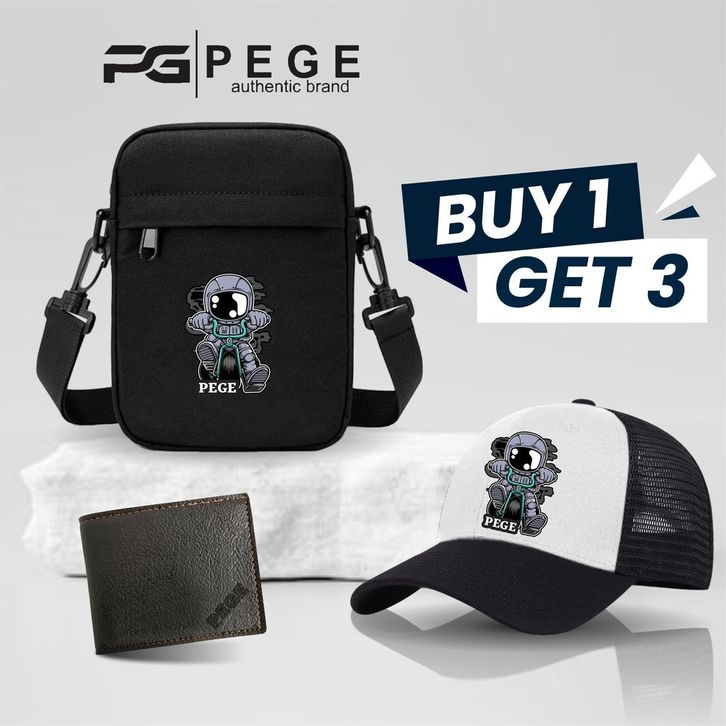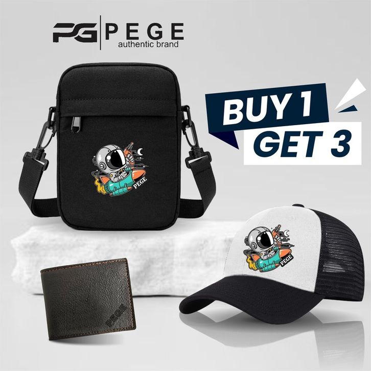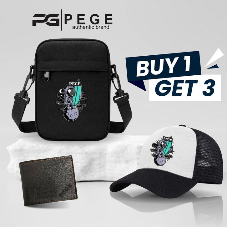 Beli 1 Dapat 3 Paket Lengkap Hemat Sling Bag PEGE PROMO Gratis Topi dan Dompet - PG Bundling 16