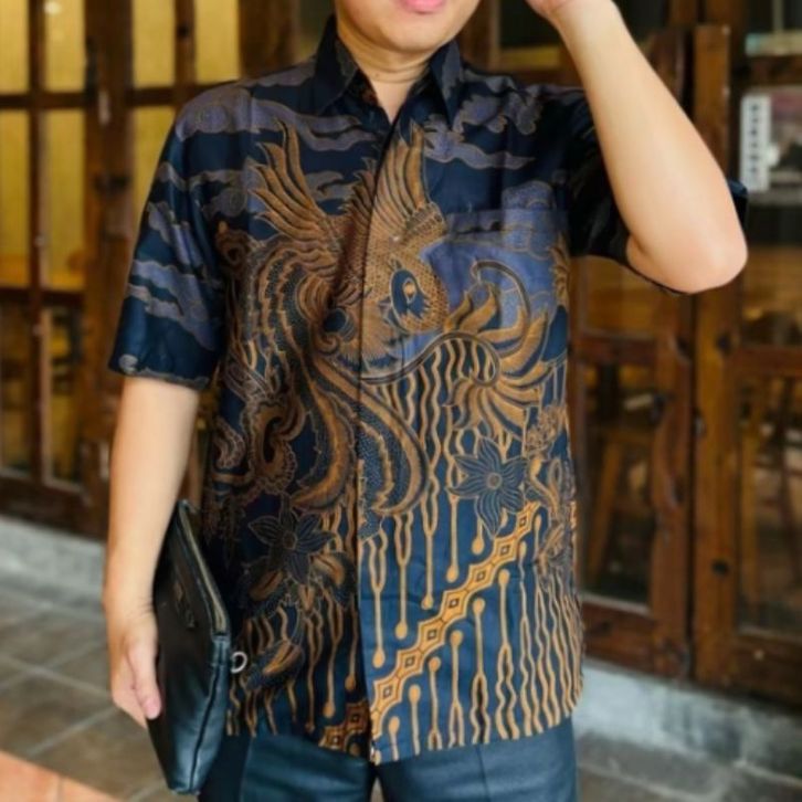 Kemeja Batik Pria MEGA MENDUNG NAVY Lengan Panjang/Pendek Bahan Katun Lapis Furing Motif Terbaru