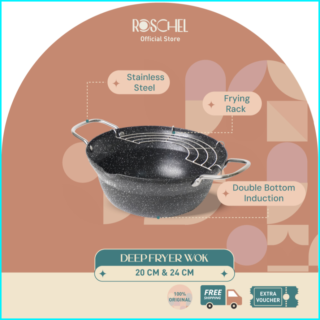 Roschel Deep Frying Wok Marble Non Stick Coating Double Bottom Induction Panci Wajan Penggorengan Stainless Anti Karat A