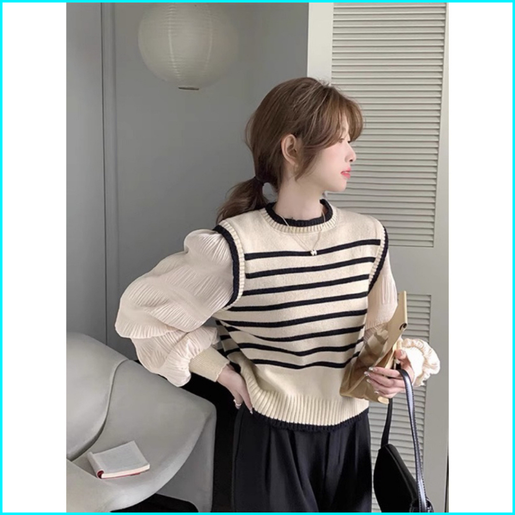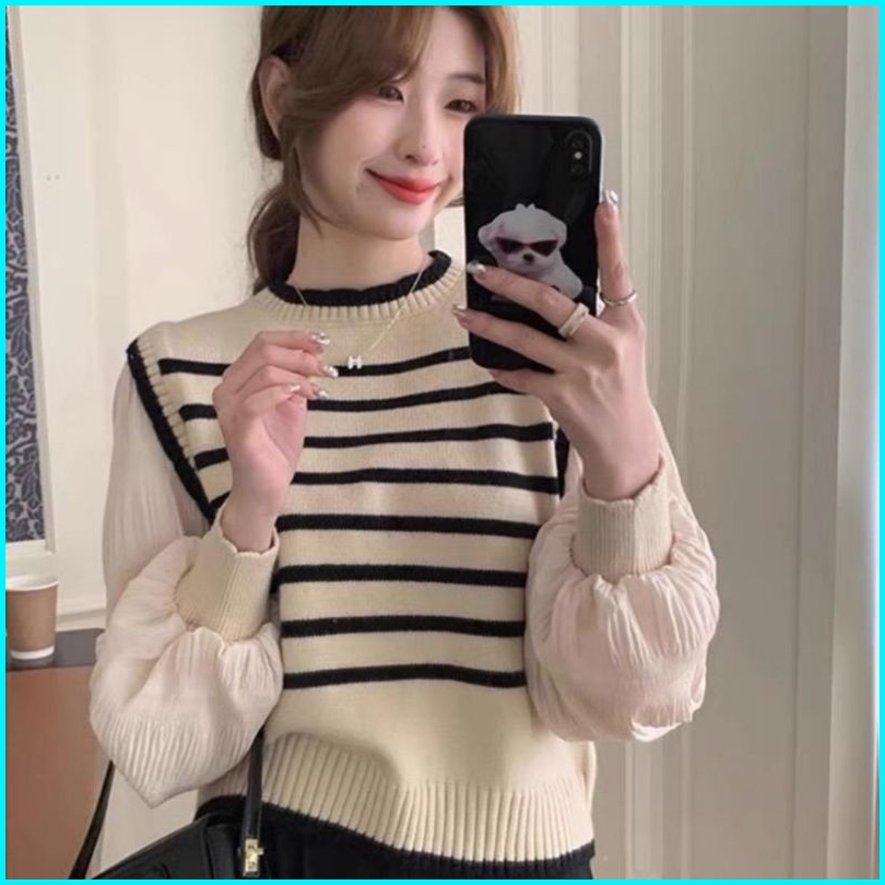 Atasan Knit Wanita Lengan Balon Lengan Panjang Basic Korean Rajut Motif Garis