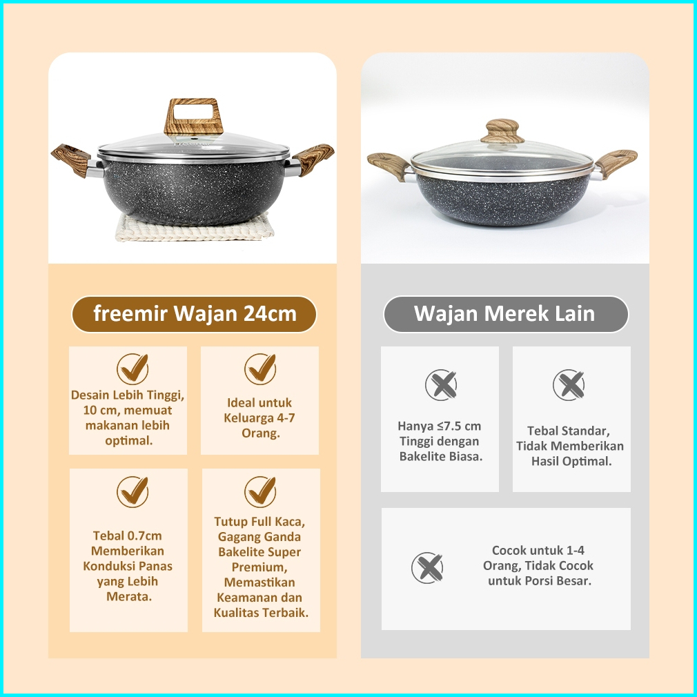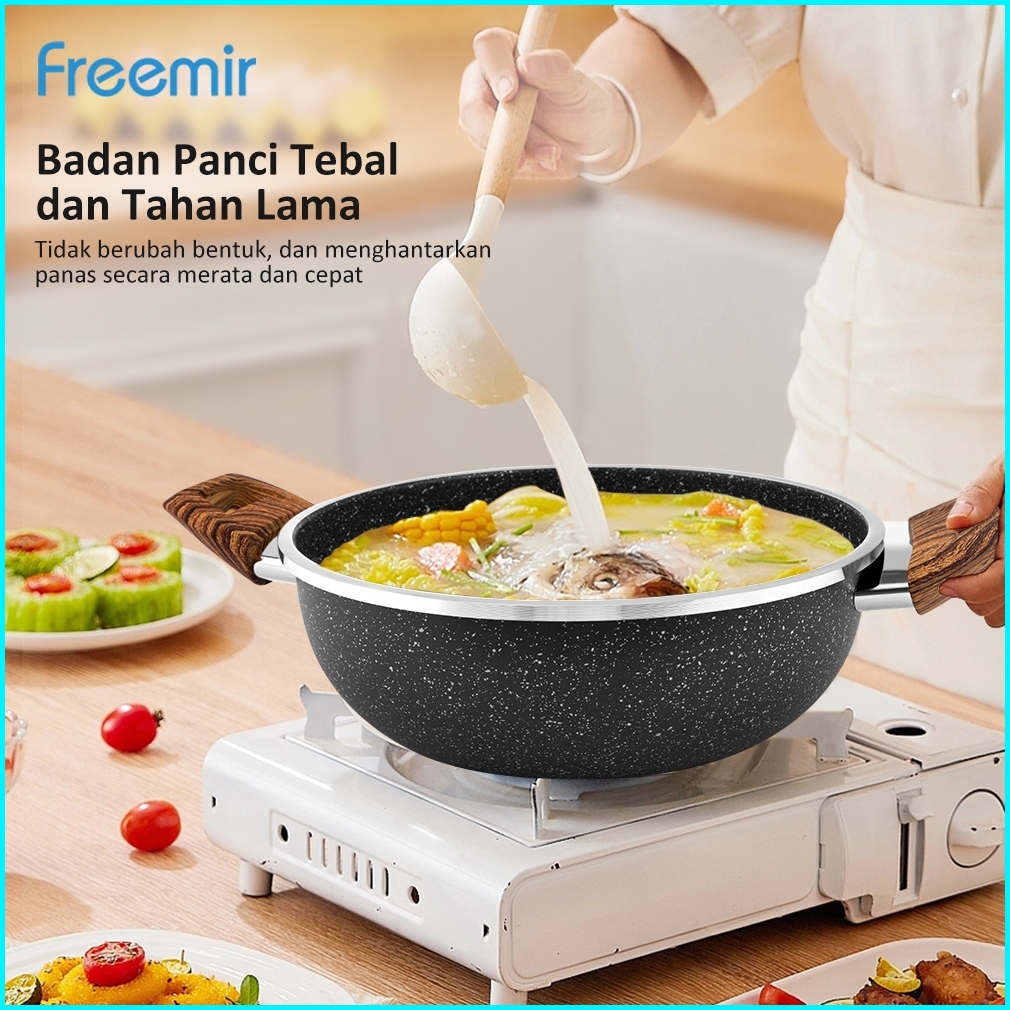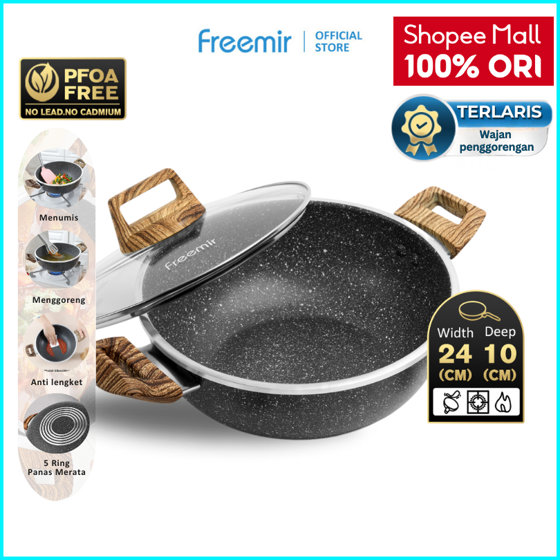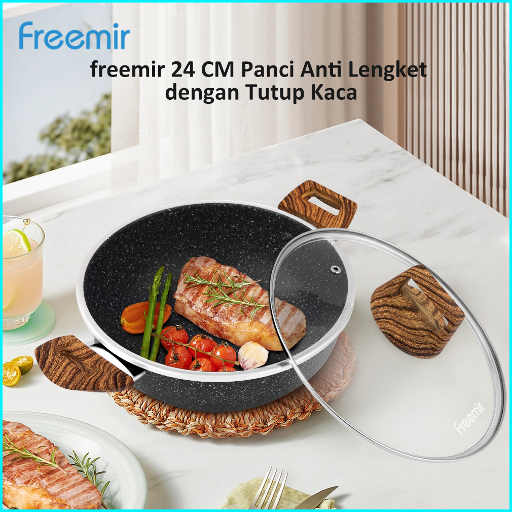 Freemir Wajan Panci 24 Cm Tinggi 10 Cm Wajan Penggorengan Anti Lengket Dengan Tutup Kaca Dan Gagang Kayu Wajan Serbaguna