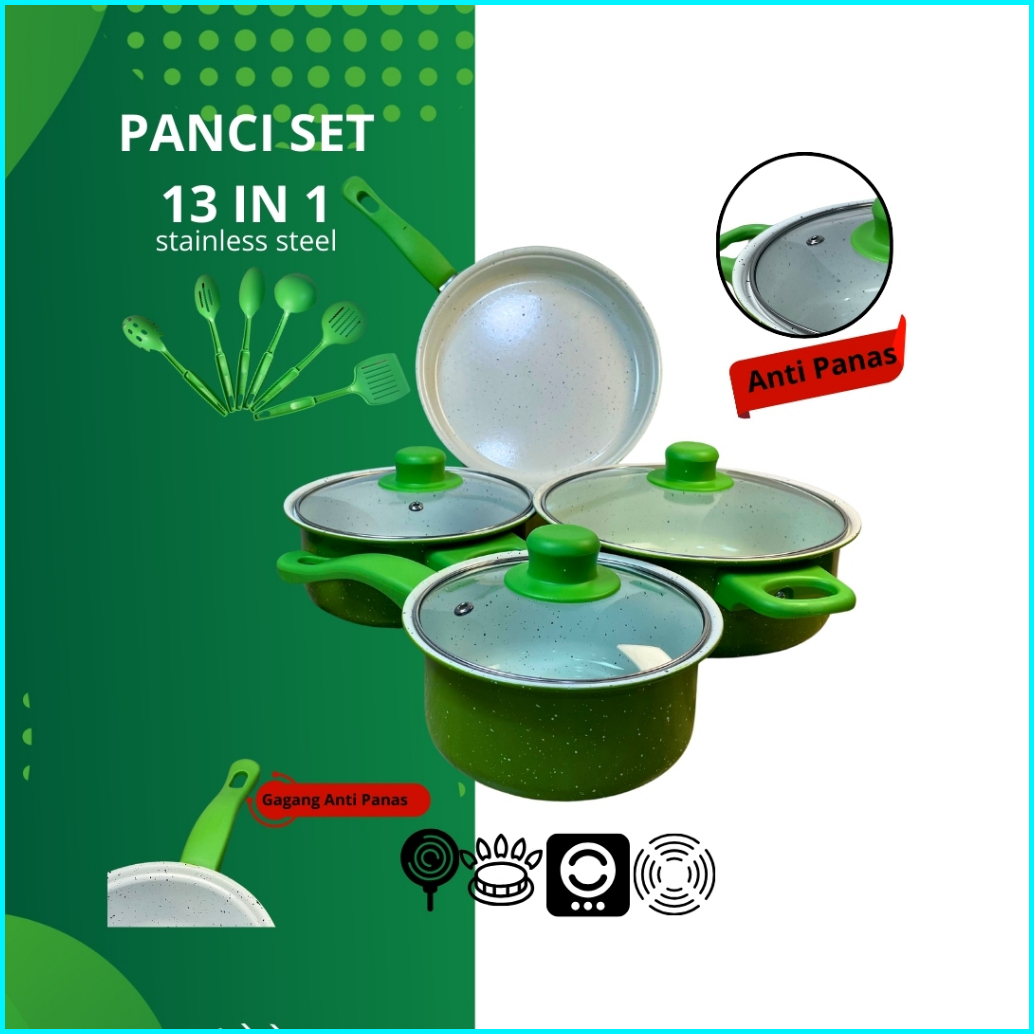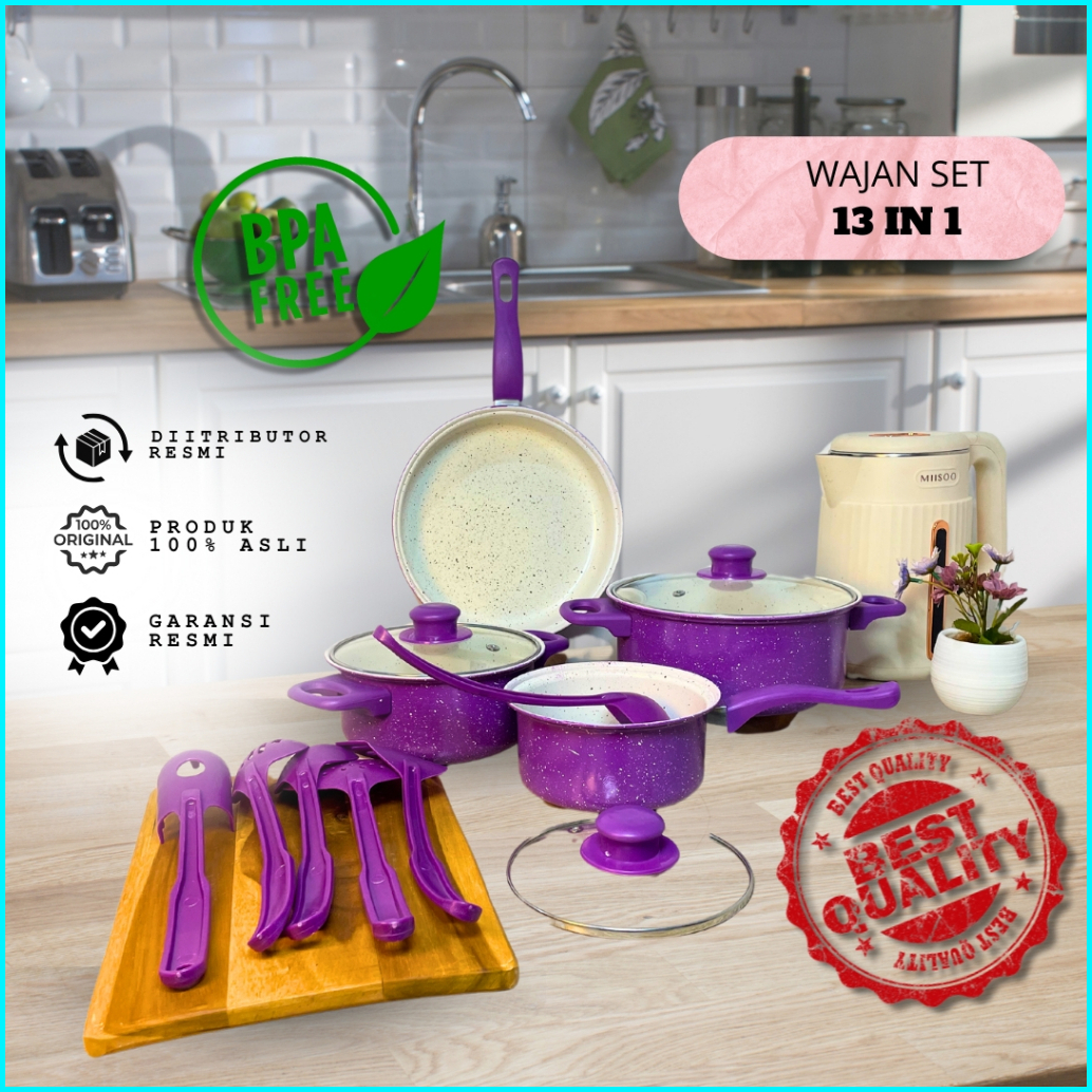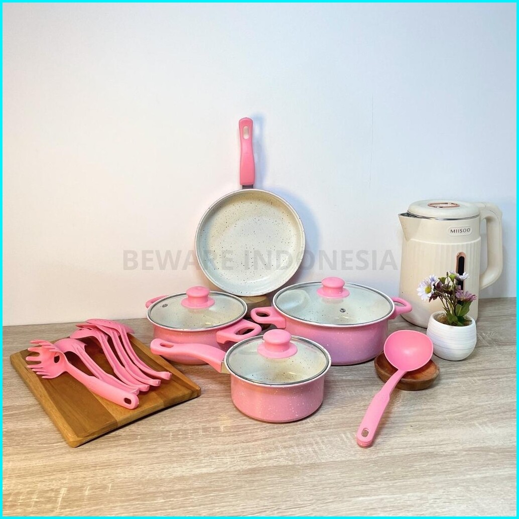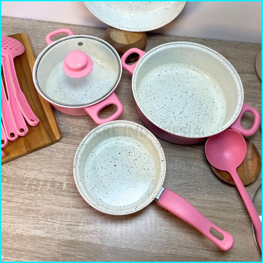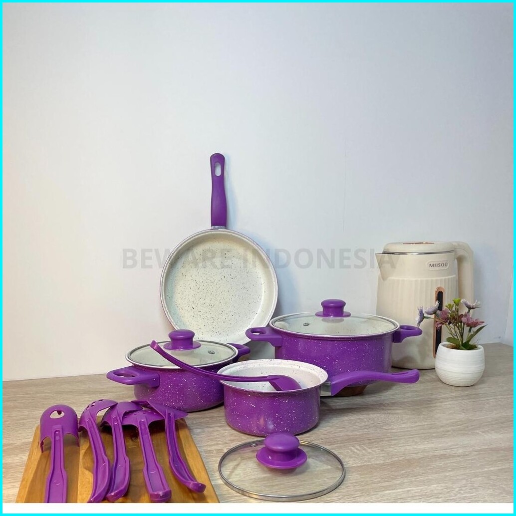 Bwi - Cookware Panci Set Frypan Spatula 13 In 1 Marble Teflon Anti Lengket 5 In 1 Peralatan Masak Tutup Kaca Serbaguna K