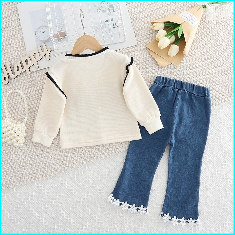 Kf Cat Setelan Lengan Panjang Anak Perempuan Bahan Katun Celana Jeans Casual Style Usia 1-4 Tahun