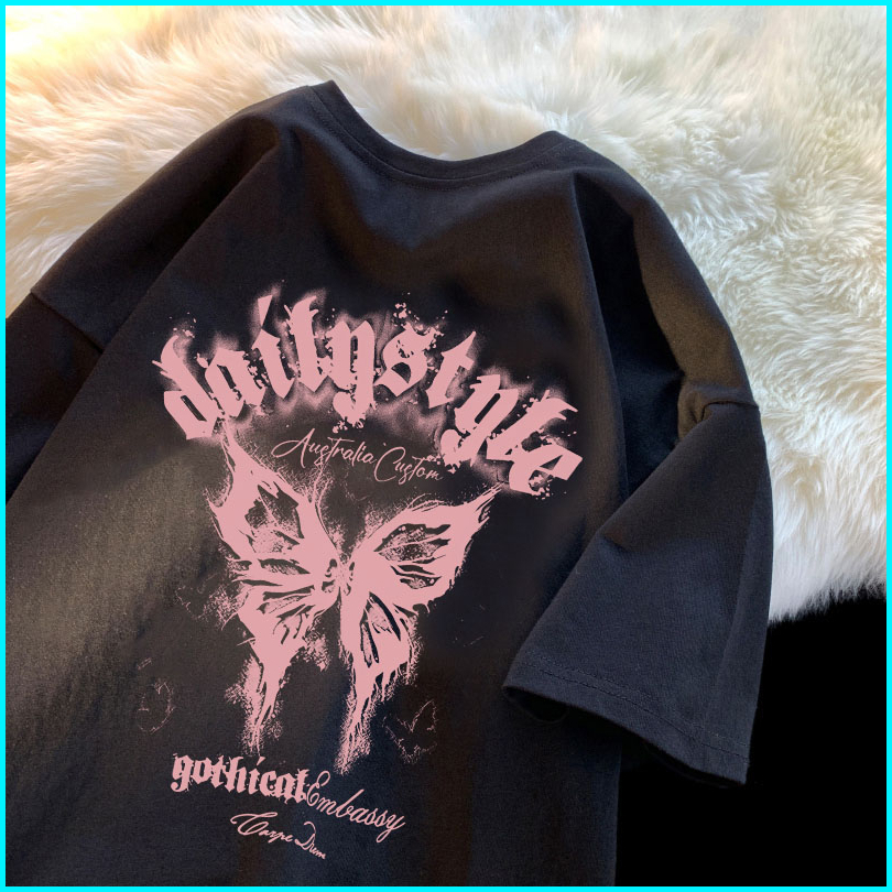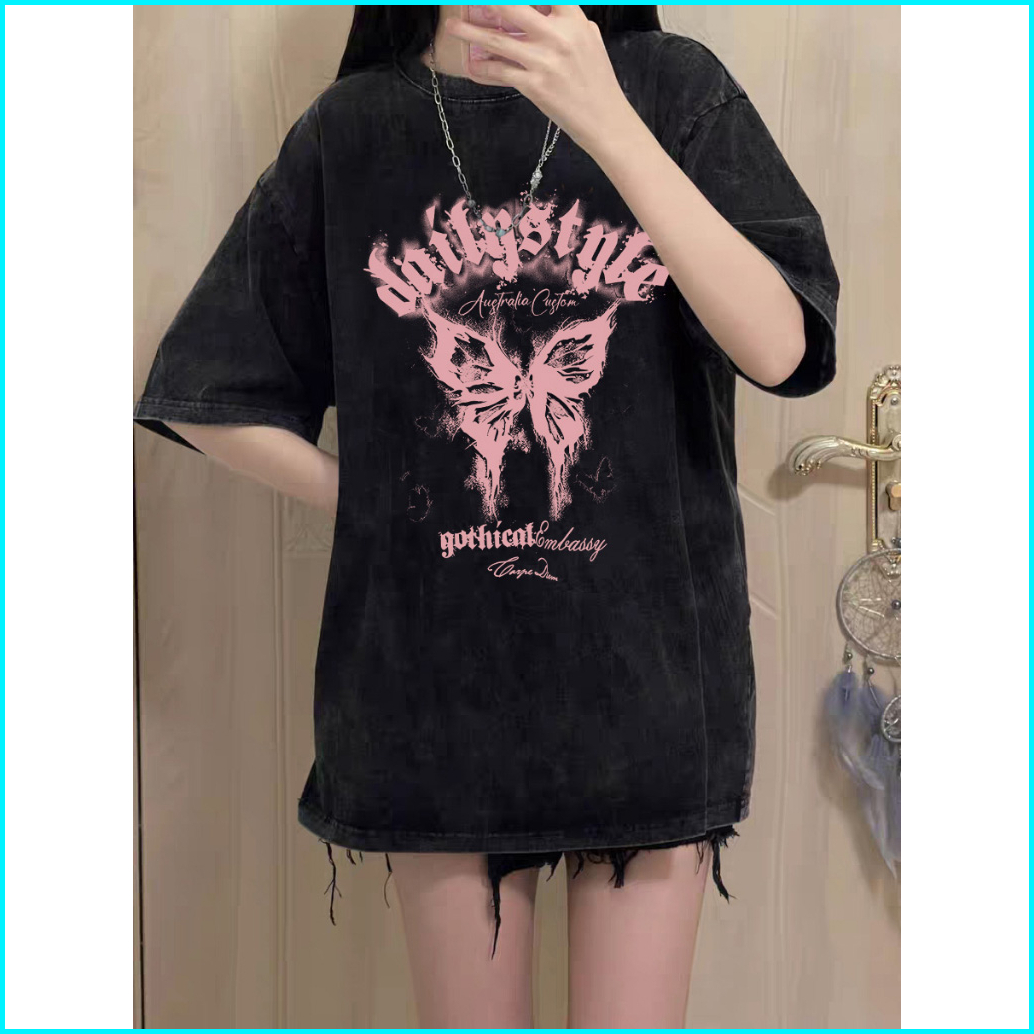 Po Floret Washed T Shirt Oversize Lengan Pendek Kaos Retro Street Butterfly Katun Murni Wanita Top Hitam