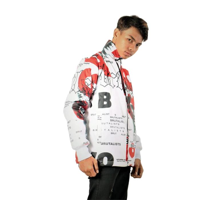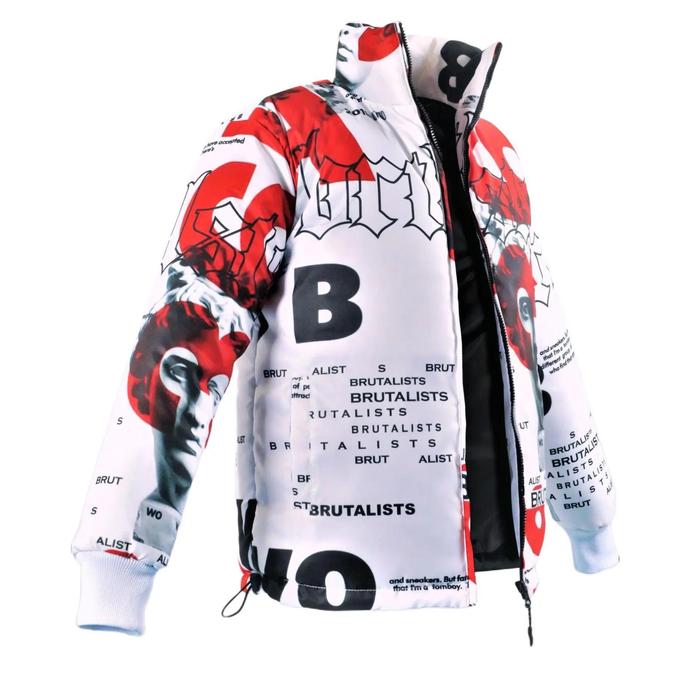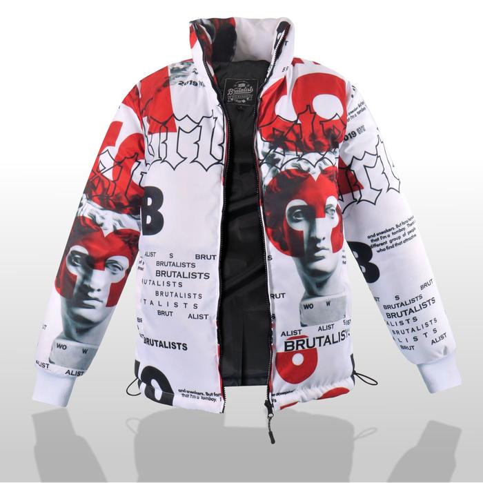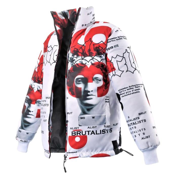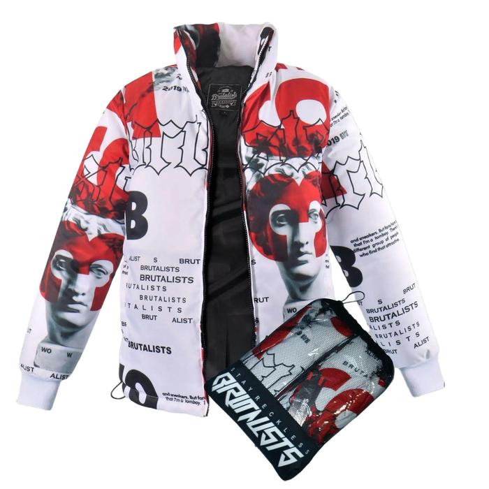 Jacket Outdoor Puffer whitethree Brutalists Varsity Panjang Motif Waterproof Vintage Printing Hitam Putih Polyester