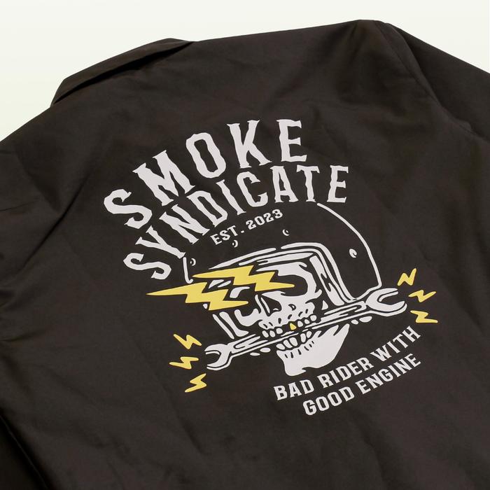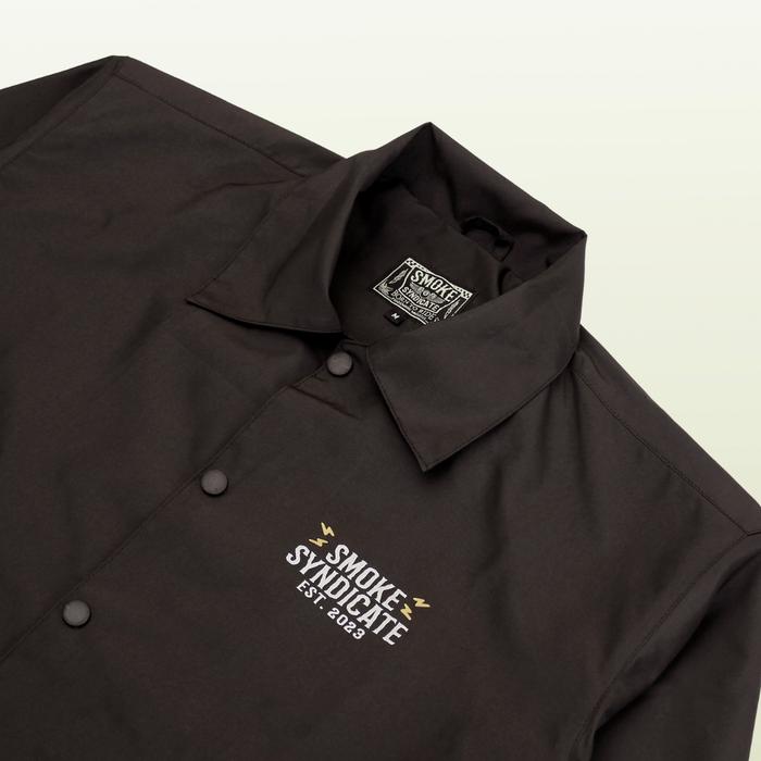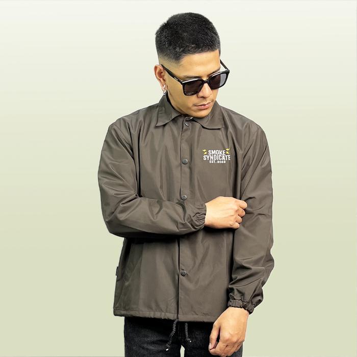 SMOKE Jaket - Coach Jacket "GLARE" Coklat Tua Panjang Nyaman Polyester Bomber Dewasa Kancing Sablon Atasan Hitam Custom