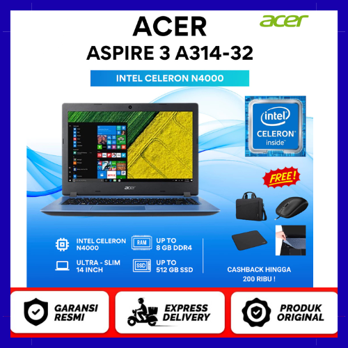 Laptop Acer Terbaru Aspire 3 A314-32 | Intel Celeron N4000 | 8gb Ram | Ssd 512gb | 14 Inch