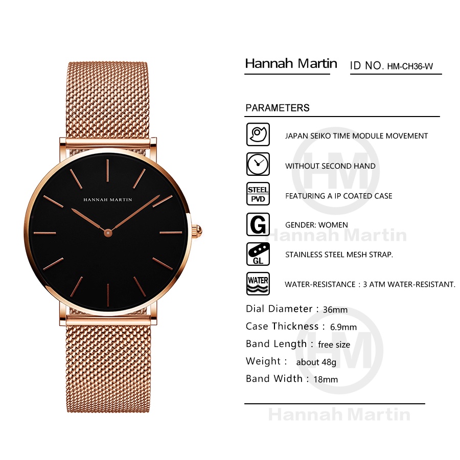 Jam Tangan Wanita Hannah Martin Ch36w Satainless Steel Elegan Tahan Air 100% Original