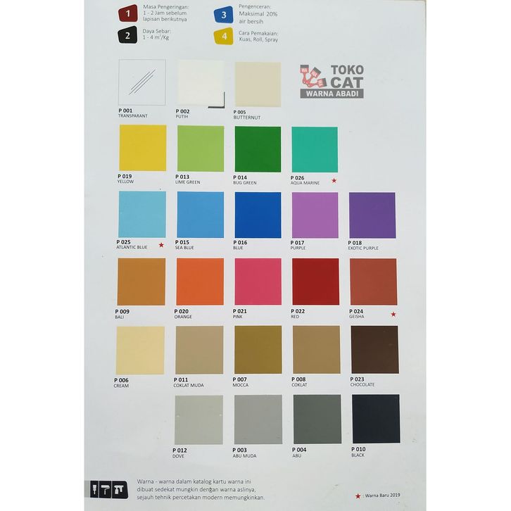 P 001 TRANSPARANT, P 002 PUTIH, P 003 ABU MUDA, P 004 ABU, P 005 BUTTERNUT, P 006 CREAM, P 007 MOCCA, P 008 COKLAT, P 009 BALI, P 010 BLACK, P 011 COKLAT MUDA, P 012 DOVE, P 013 LIME GREEN, P 014 BUG GREEN, P 015 SEA BLUE, P 016 BLUE, P 017 PURPLE, P 018 EXOTIC PURPLE, P 019 YELLOW, P 020 ORANGE, P 021 PINK, P 022 RED, P 023 CHOCOLATE, P 024 GEISHA, P 025 ATLANTIC BLUE, P 026 AQUA MARINE