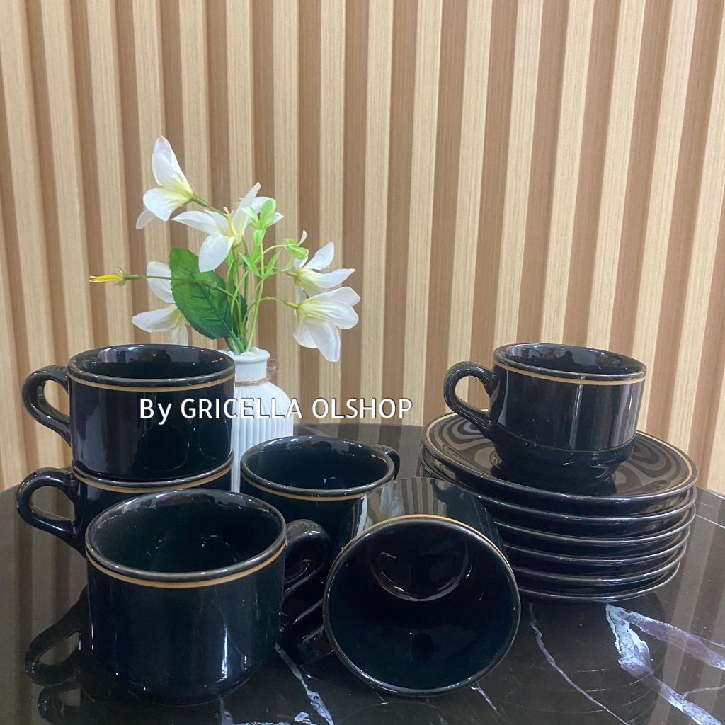 1 SET GELAS KERAMIK MAWAH ISI 12 PCS / SET CANGKIR KOPI LUCKY KERAMIK ( 6 CUPS + 6 SOUCERS )