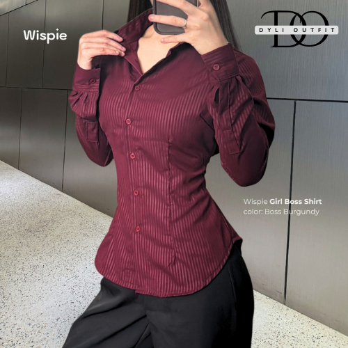 Kemeja kerja wanita Wispie Girl Boss Fitted Shirt fit garis stripe karet Lembut pink hijau biru DO877