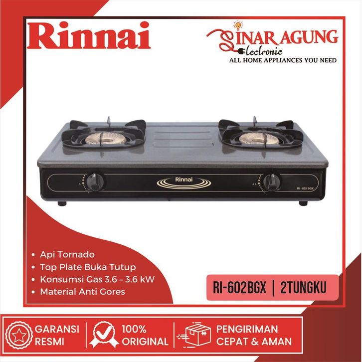 KOMPOR GAS RINNAI RI602BGX / RI-602 / RI602 HITAM (API TORNADO / 2 TUNGKU) 100% ORIGINAL