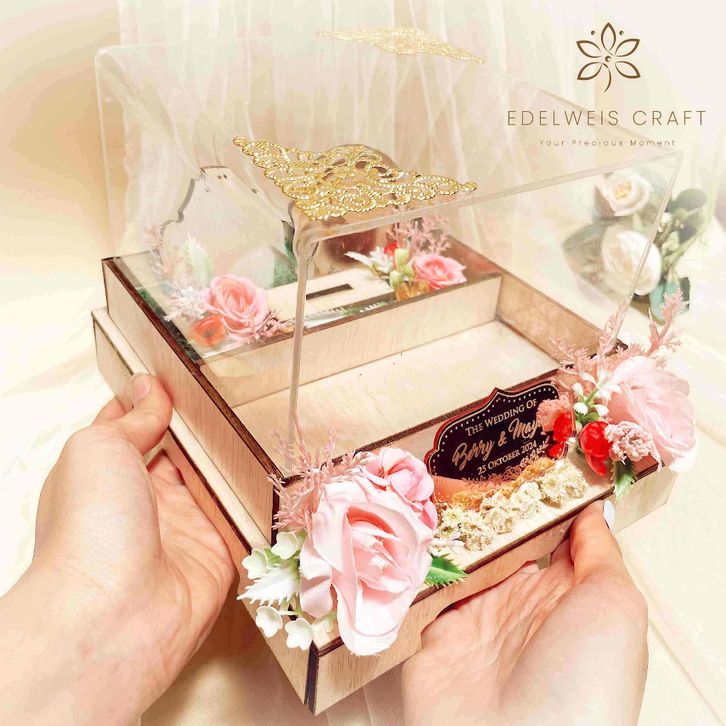 (Tersedia) Kotak Hantaran Pernikahan Uangg dan Perhiasan Full Set XL Kayu Akrilik Dengan Bunga Artificial
