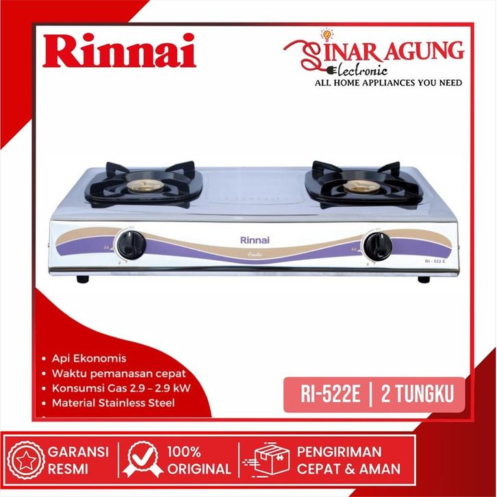 RINNAI RI522E / RI-522E KOMPOR GAS 2 TUNGKU STAINLESS STEEL - 100% ORI
