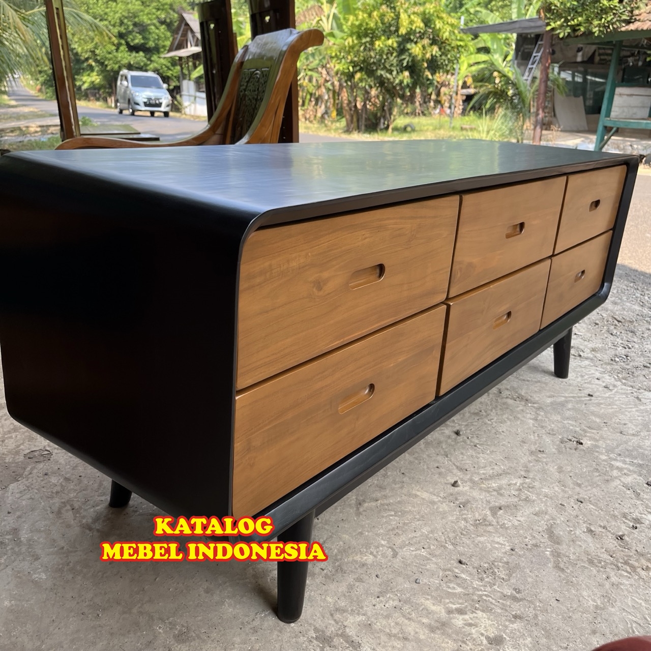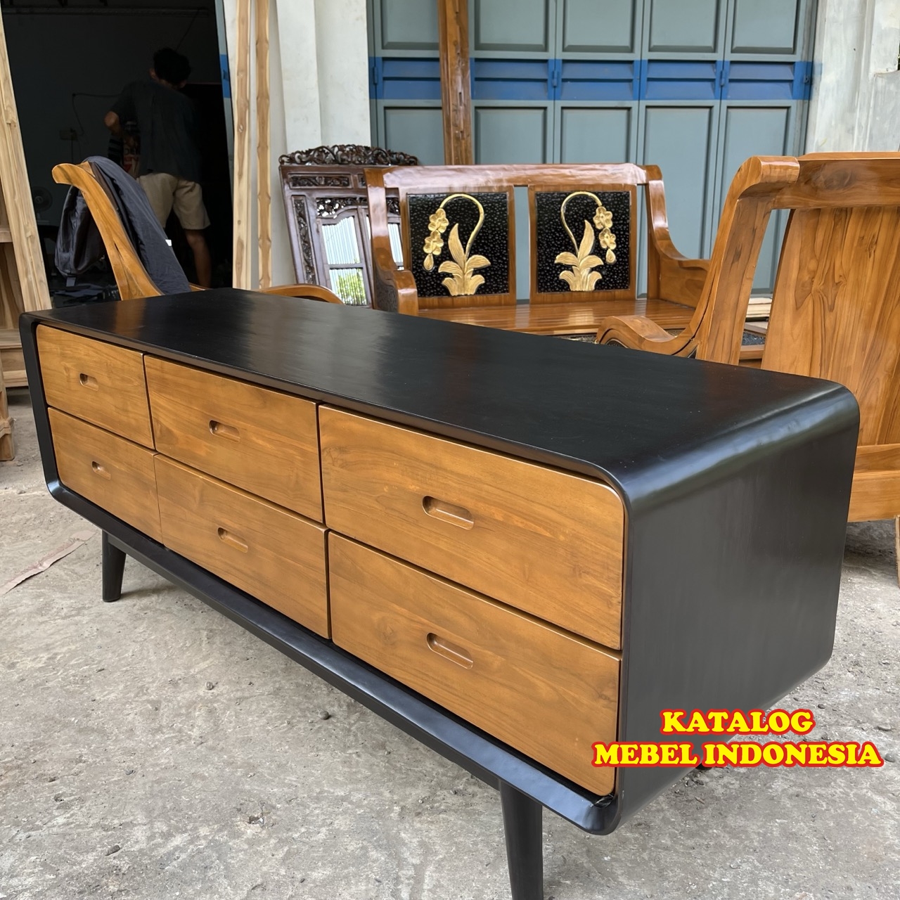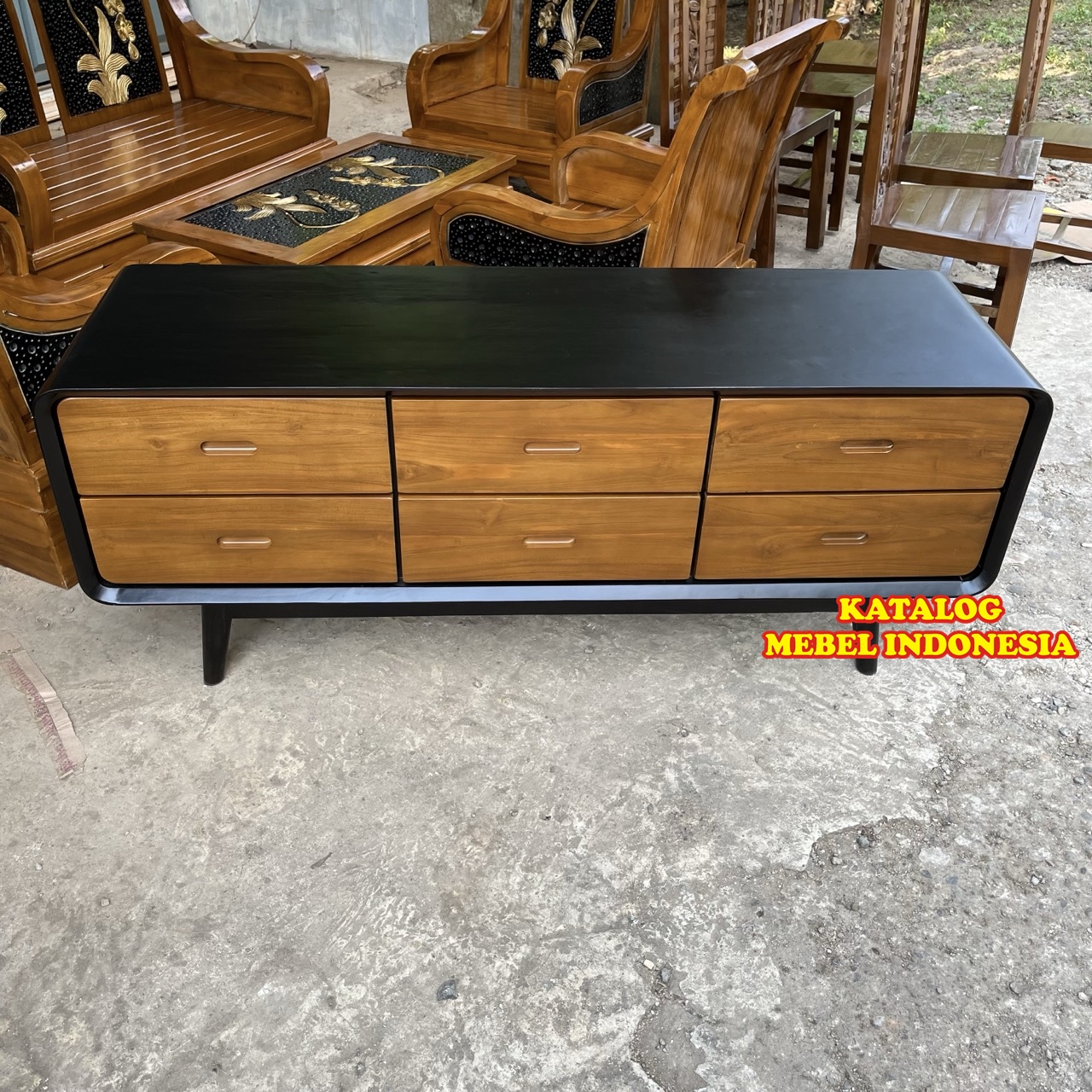 Meja TV Minimalis 6 Laci Kayu Jati Model Retro - Buffet Furniture