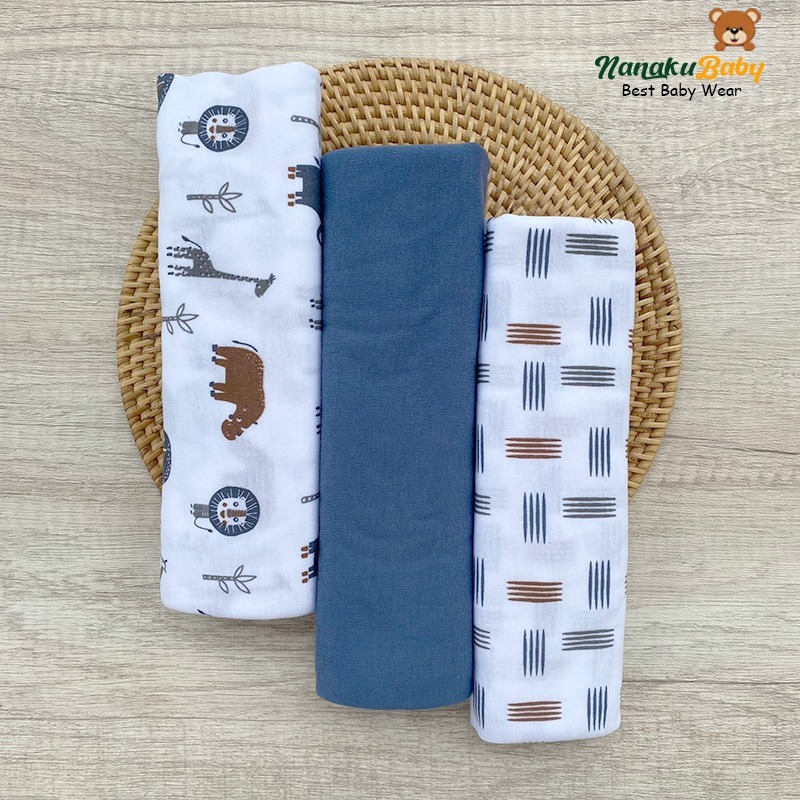 Nanaku Baby - (Series Biru Denim) Bedong Bayi Newborn Isi 3 Pcs Ukuran Jumbo 110x90 Cm Pernel Bayi Multifungsi