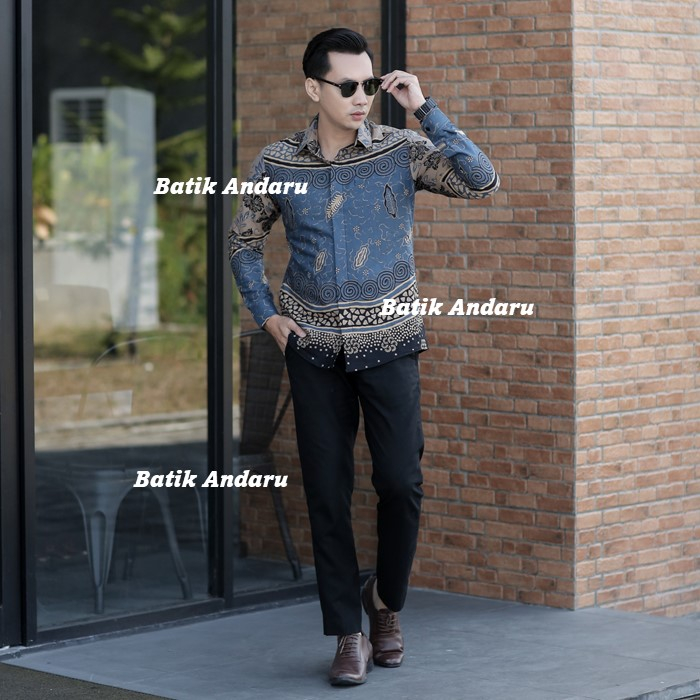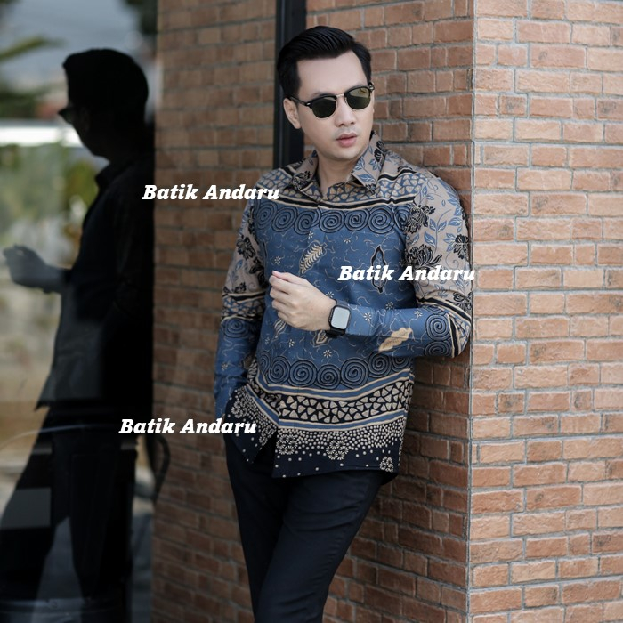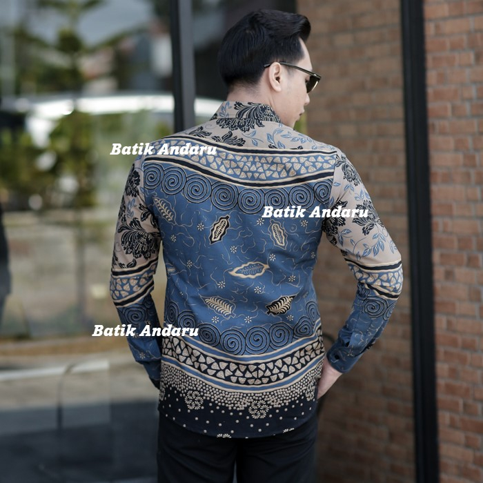 Batik Andaru Motif Kamal Baju Batik Pria Slimfit Lengan Panjang Full Furing Ero Warna Biru Denim