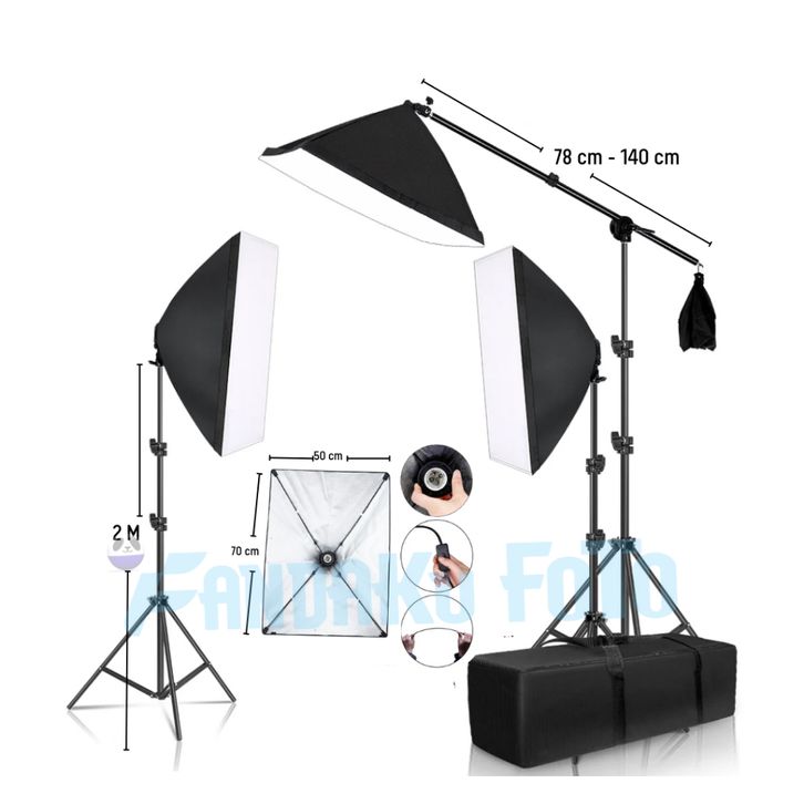 Paket set studio komplit lampu foto videPaket set o produk dengan softbox lampu 5500 kelvin meja + background pvc board