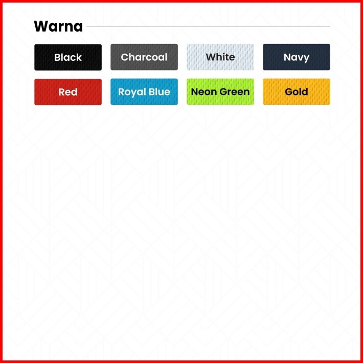 BLACK, CHARCOAL, GOLD, NAVY, NEON GREEN, RED, ROYAL BLUE, WHITE