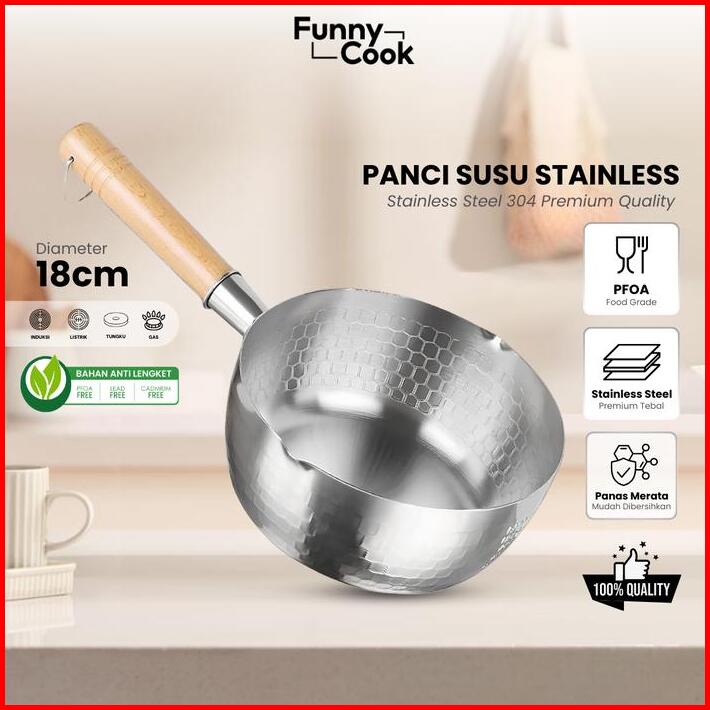 Funnycook Panci Mie Stainless 18cm 304 Food Grade Quality Gagang Kayu Asli 18cm Kitchenware