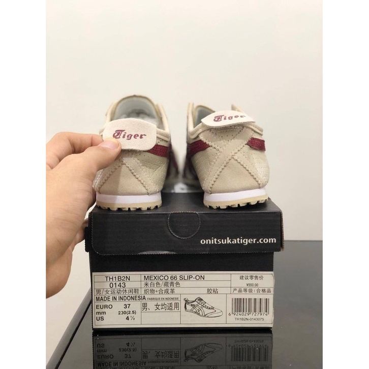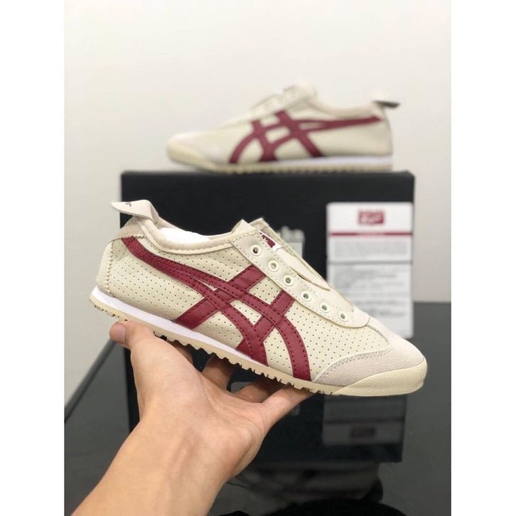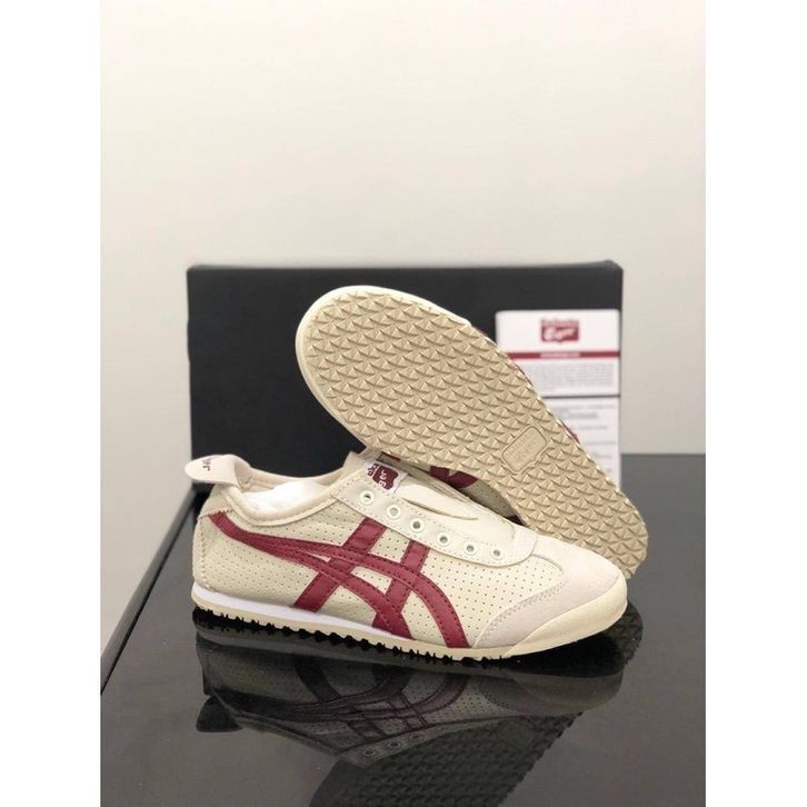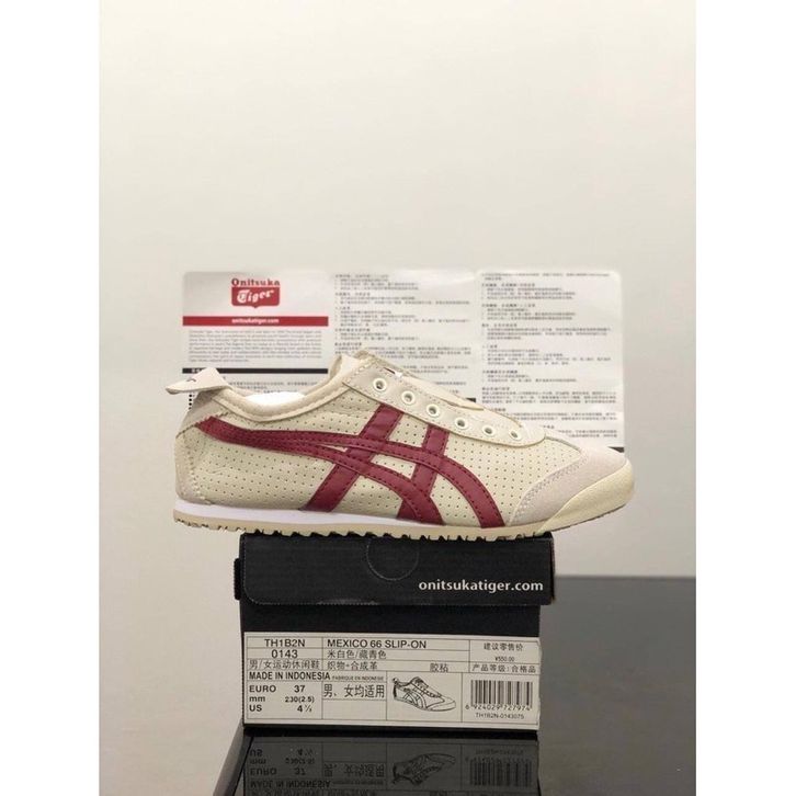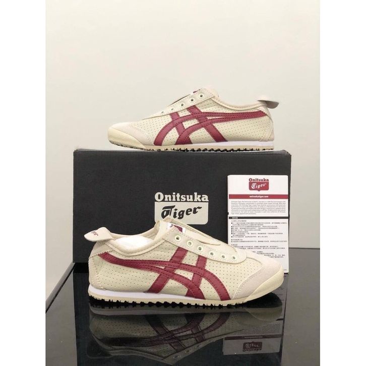 Sepatu 0nitsuka Tiger Slip On Leather Cream Maroon Sneakers Wanita Casual