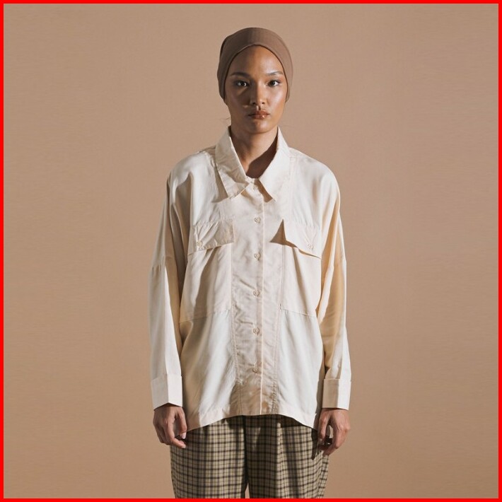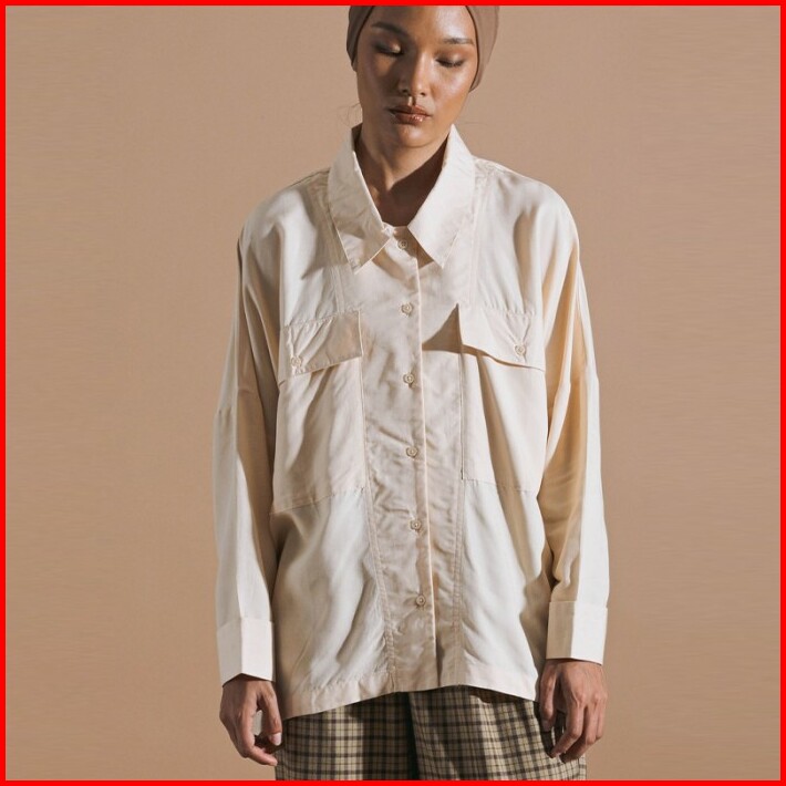 3second Kemeja Oversize Lengan Pendek Wanita Double Pocket Cream