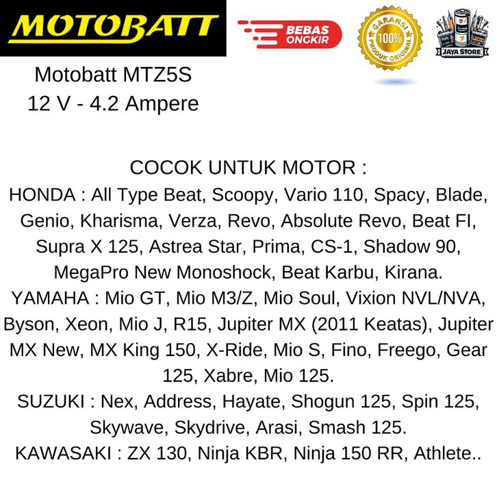 AKI MOTOR BEAT FI NON ISS, BEAT KARBU, Vario TECHNO 110 MOTOBATT MTZ5S