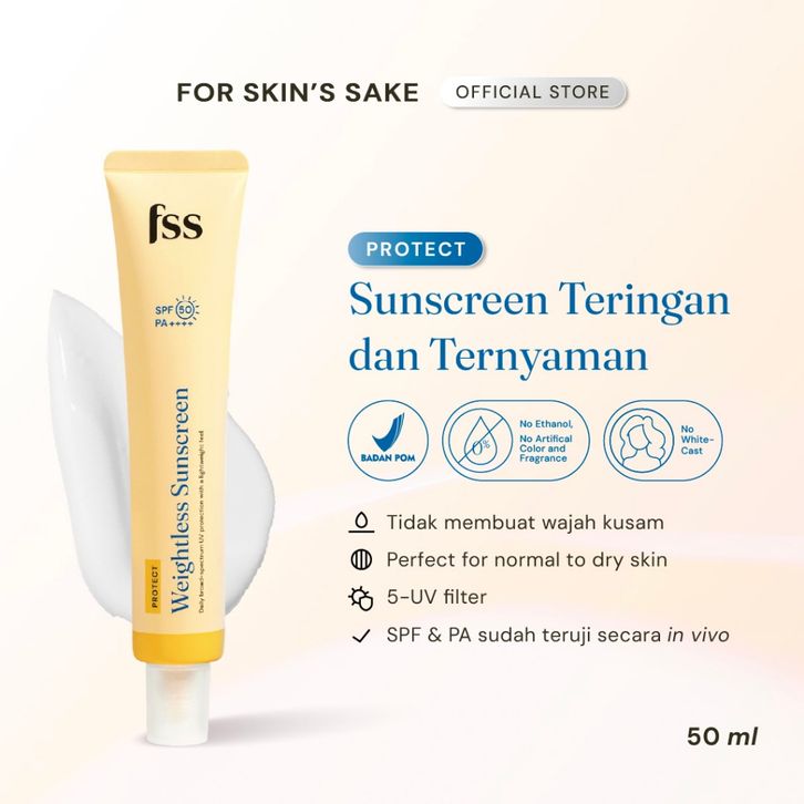 For Skin's Sake FSS Weightless Sunscreen SPF 50 PA ++++ Perlindungan Maksimal Untuk Kulit Normal Hingga Kering.