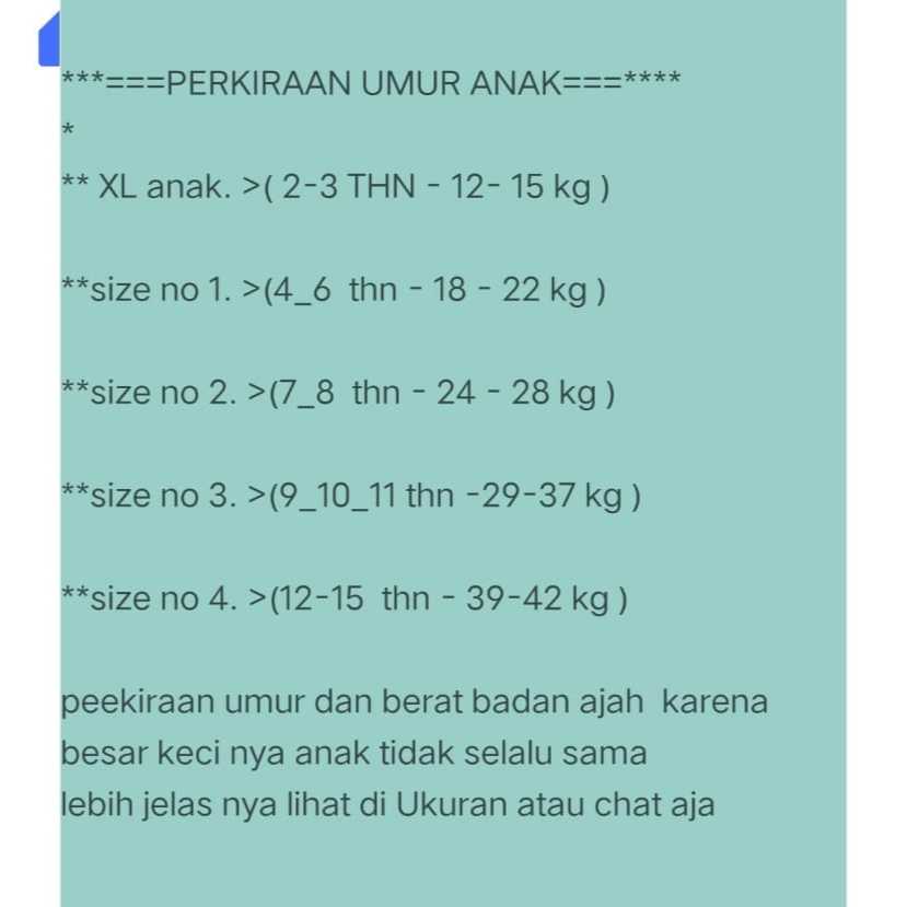 Size ( 2-3 tahun ), Size No 1 (4-5 THN), Size No 2 (6-7 thn ), Size no 3 (8-10 thn), Size 4 (12-15 thn)
